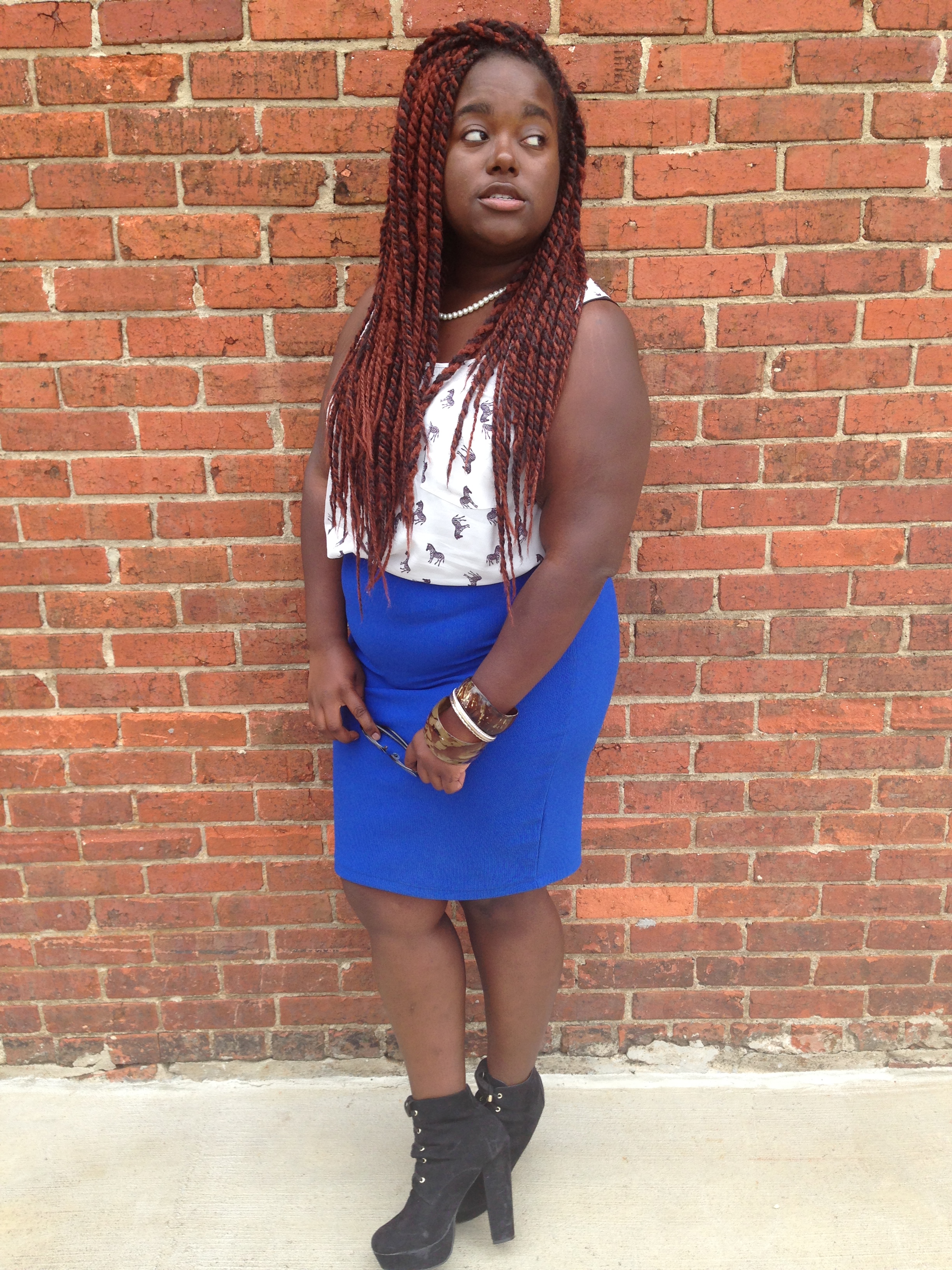 The second look is from Fall semester of my senior year. The organization that I was president of was having sign-ups that day so I decided to show up and show out, just a little bit. The top is my favorite Zebra shirt from Forever 21. The blue pencil skirt is also from Forever 21 and the boots are from Charlotte Russe.