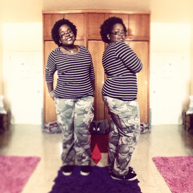 These two looks below focus on my favorite pants that I own. The army fatigue pants were given to me by a friend and when I tried them on I knew that they were going to be mine for a while. I believe that they are from Old Navy’s Men section. They be men’s but thy are the perfect high waisted pants. Usually I would just wear a solid color shirt but on these two occasions I wanted to do something a little different. Since the pants cover my tummy, I took advantage of it and wore my multi-color crop top from Fashion To Figure. It was a perfect fit with the peach clutch and sandals that I wore with it. The other occasion was just a regular day on campus where I was going to run a few errands after class. The 3/4 sleeve black and white stripe shirt is from Forever 21. Its one of my go to shirts where I won’t need a jacket because its so comfy and warm.