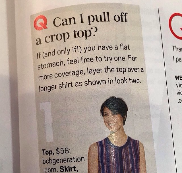 O Magazine has an article surfacing around social meadia that states some rude advice about wearing crop tops. “Can I pull off a crop top? If (and only if!) you have a flat stomach”… I beg to differ. How dare this magazine fat sham all the women that don’t have flat stomachs. I know I don’t have a flat stomach and I know for sure I wear crop tops all the time. I also know plenty of other plus size women that slay a crop top every time they wear one.