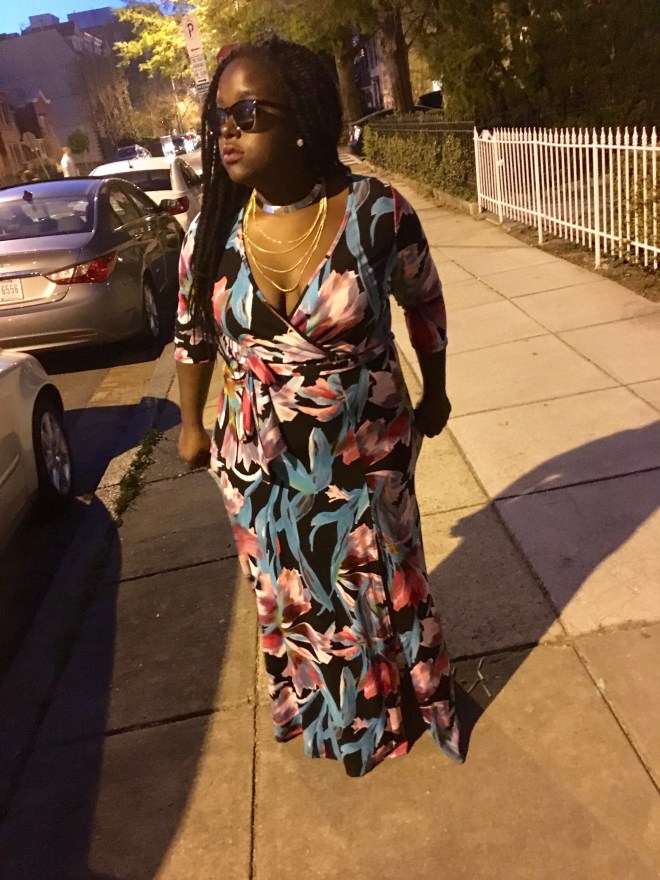 As you can tell the neckline is very deep. I usually would pin a neckline that deep, but I stepped out my comfort zone and kept it just like this. I knew that a necklace would be needed especially since I wasn’t pinning it! The 5-chain necklace was perfect! It brought attention, but completed the look. I was also skeptical about what sandals to wear, but that didn’t matter at all. With me being so short the dress actually covered my feet (BONUS!!)