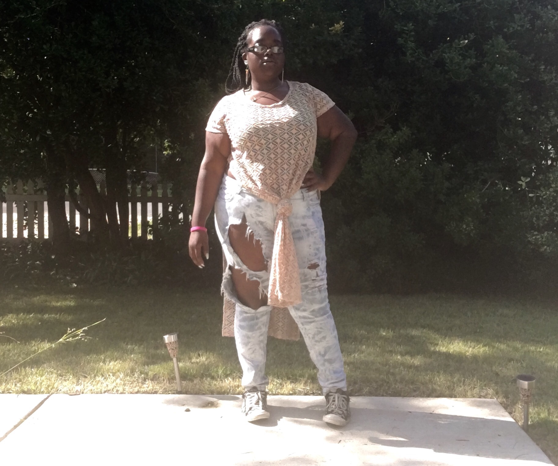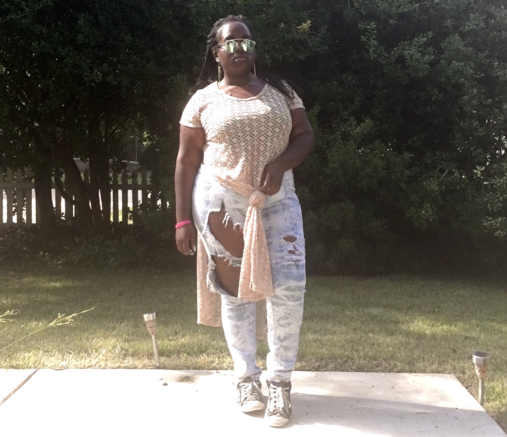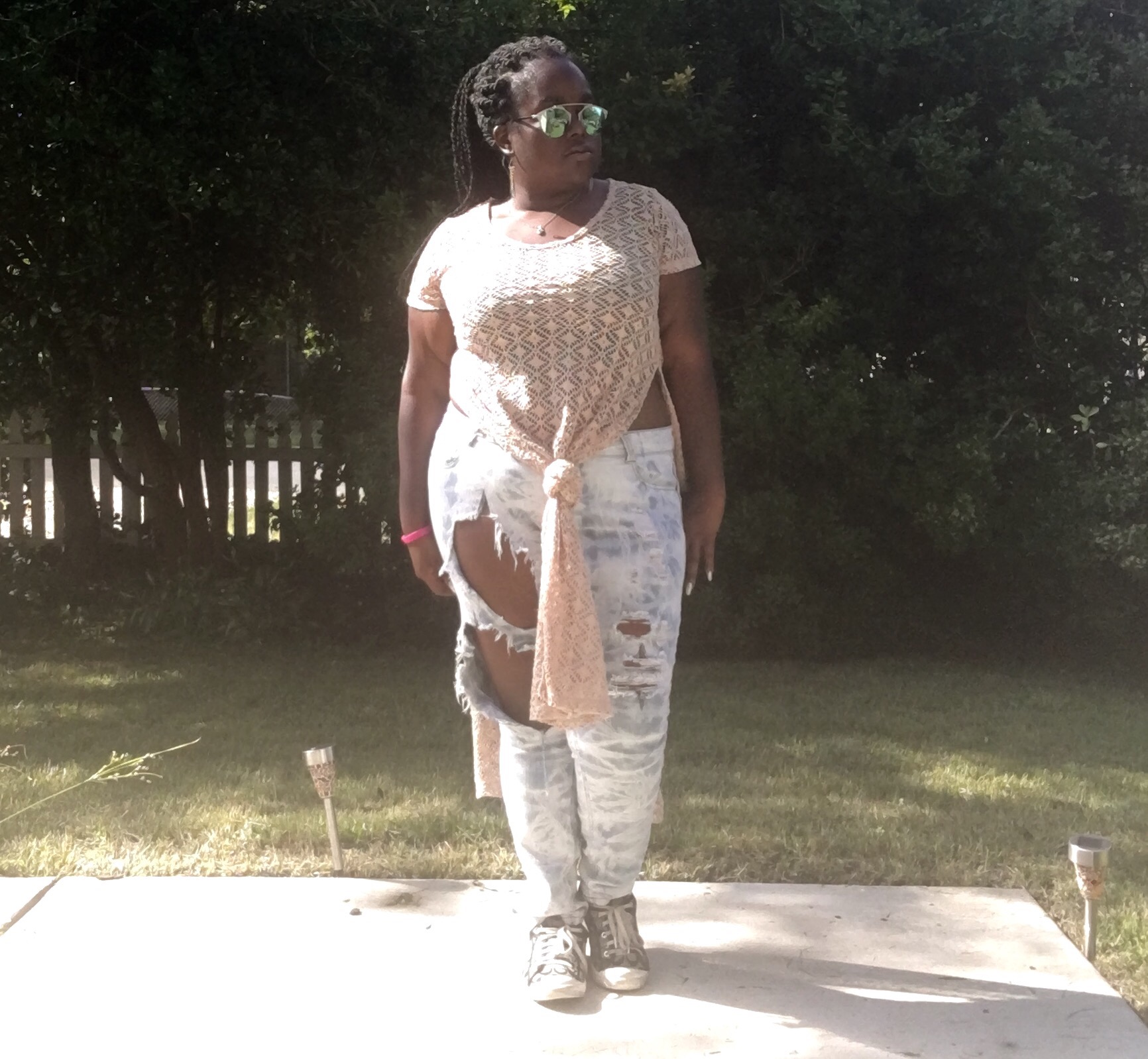 It’s something about these jeans. Yes, my thighs are all out and showing but I love them. It gives the jeans an edgy feel. They are the perfect fit. Tight enough on my hips to stay up, but lose enough on my thighs so they aren’t squeezing through the holes.