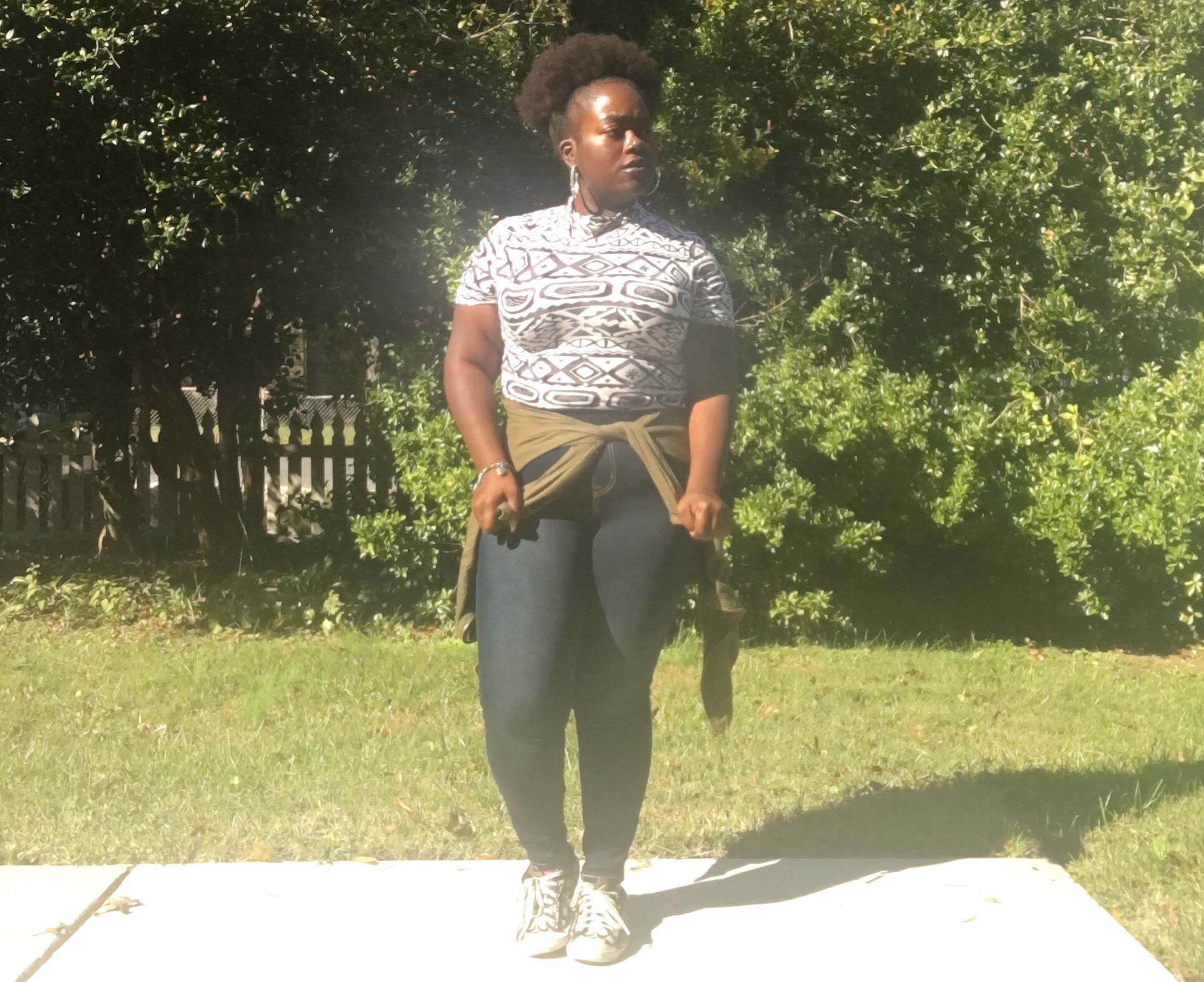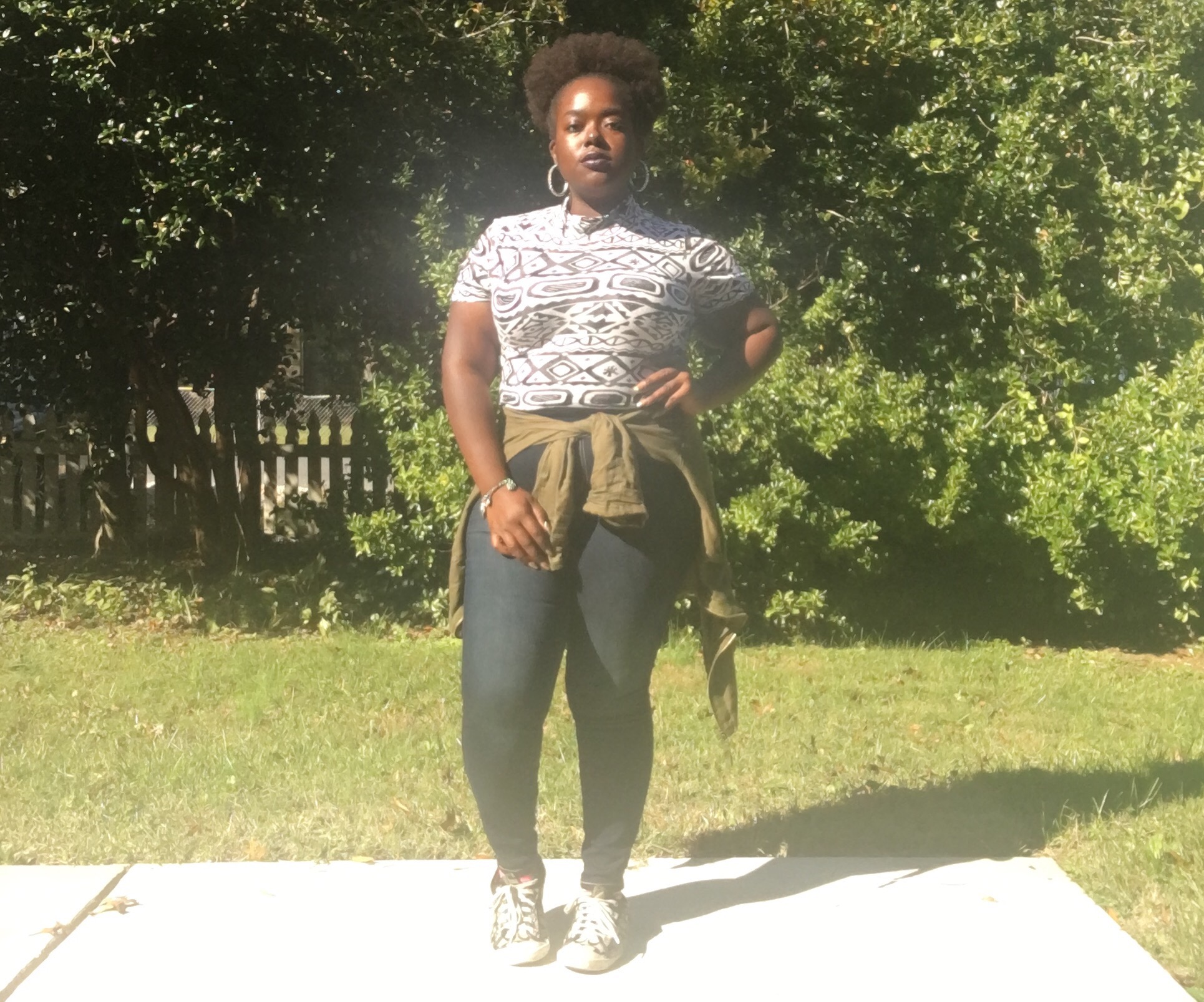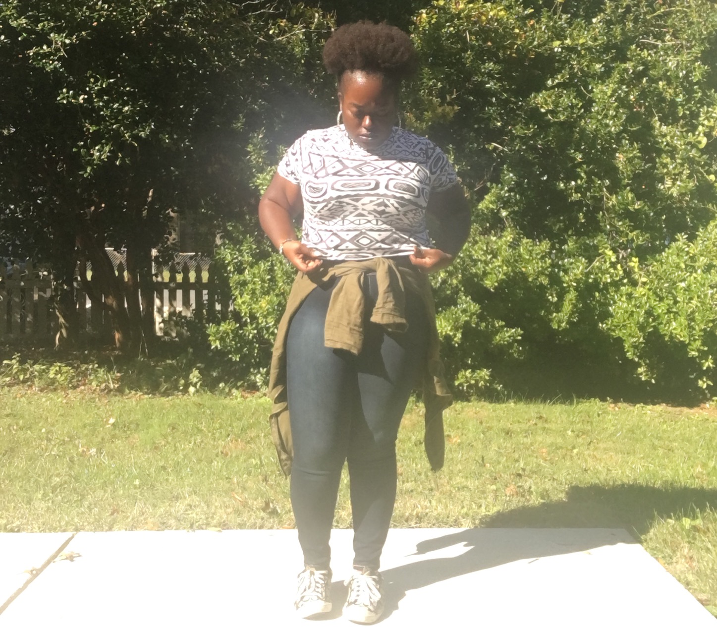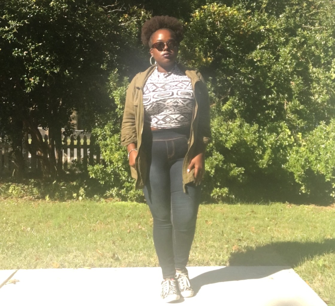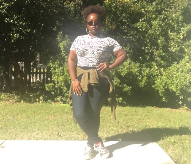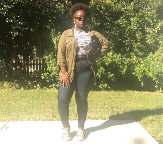 Crop top, skinny jeans, & my olive jacket to give it the fall touch: the perfect summall look. The shades just give this and any look the extra kick. You may never know when you need to be shady lol