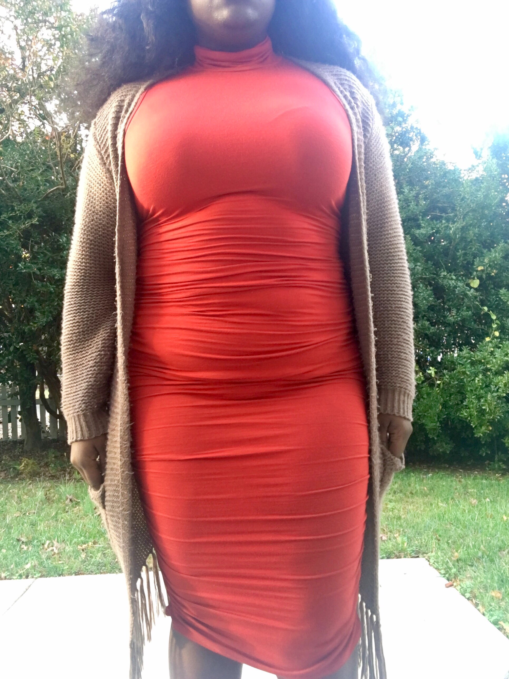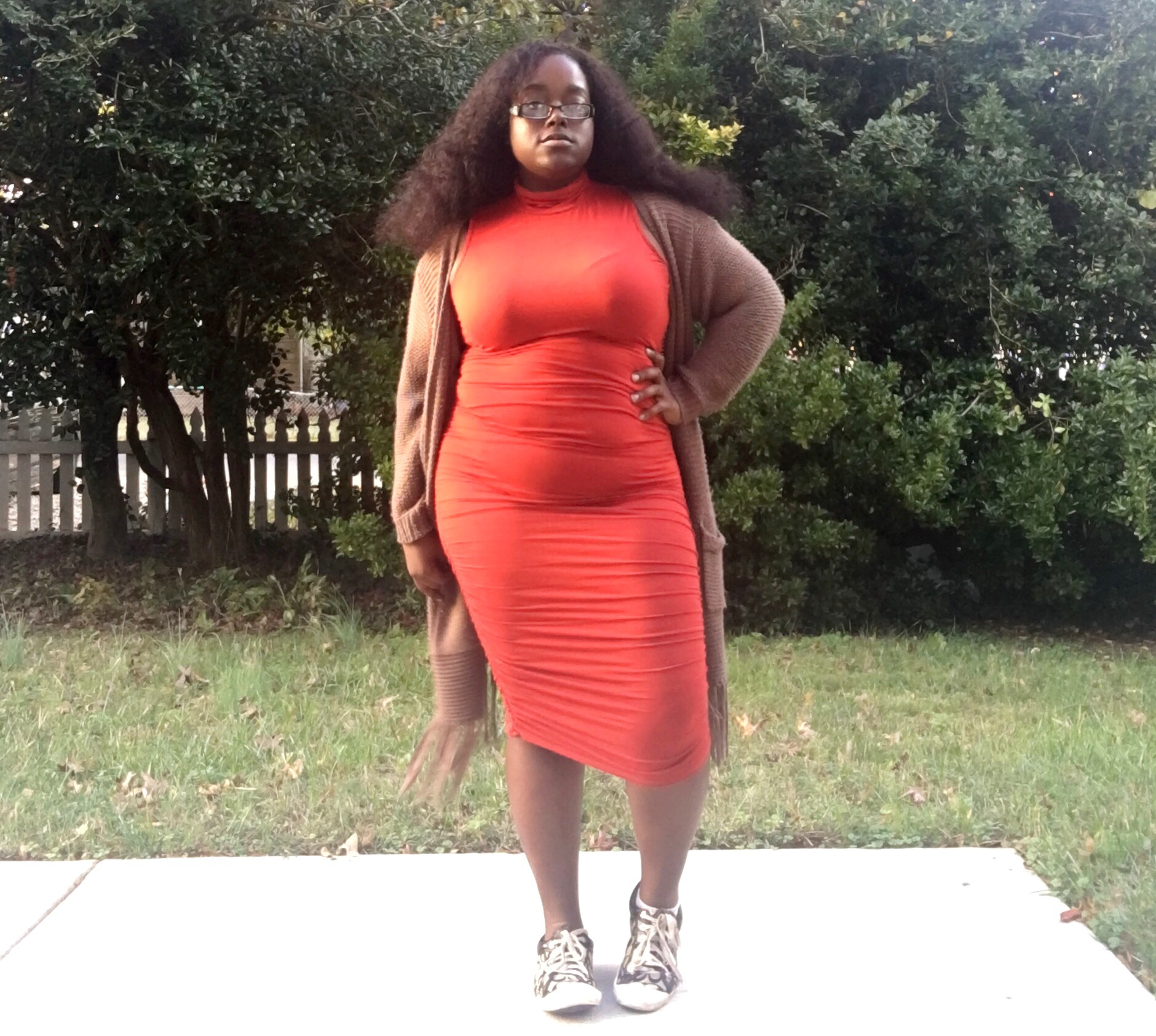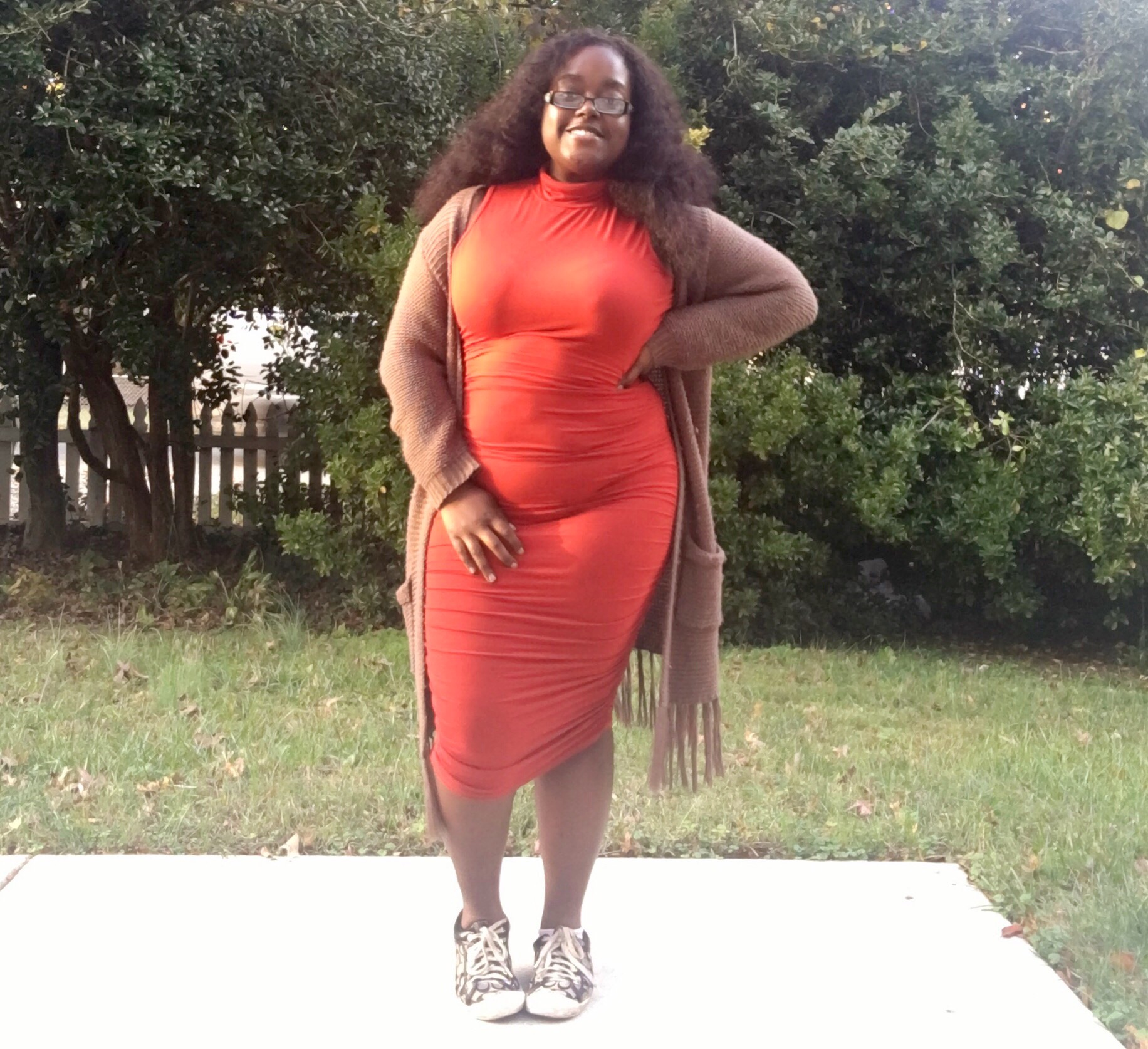 My intention was to be Velma from Scooby Doo, but of course the morning of Halloween I realized I didn’t have the red shoes or orange knee highs. So I went with my go to look, dress, tennis shoes, and a cardigan. If somebody asked me what I was, I would say a curvy pumpkin. Such a last minute ‘costume’and I’m still cute.