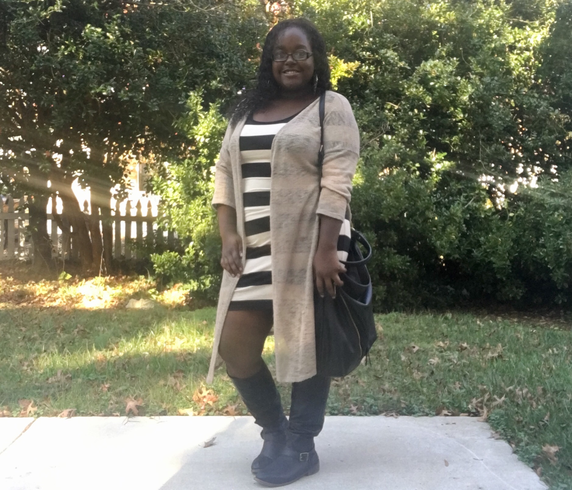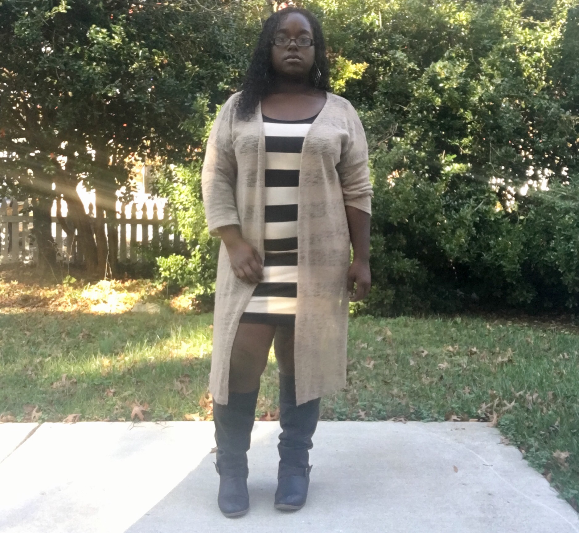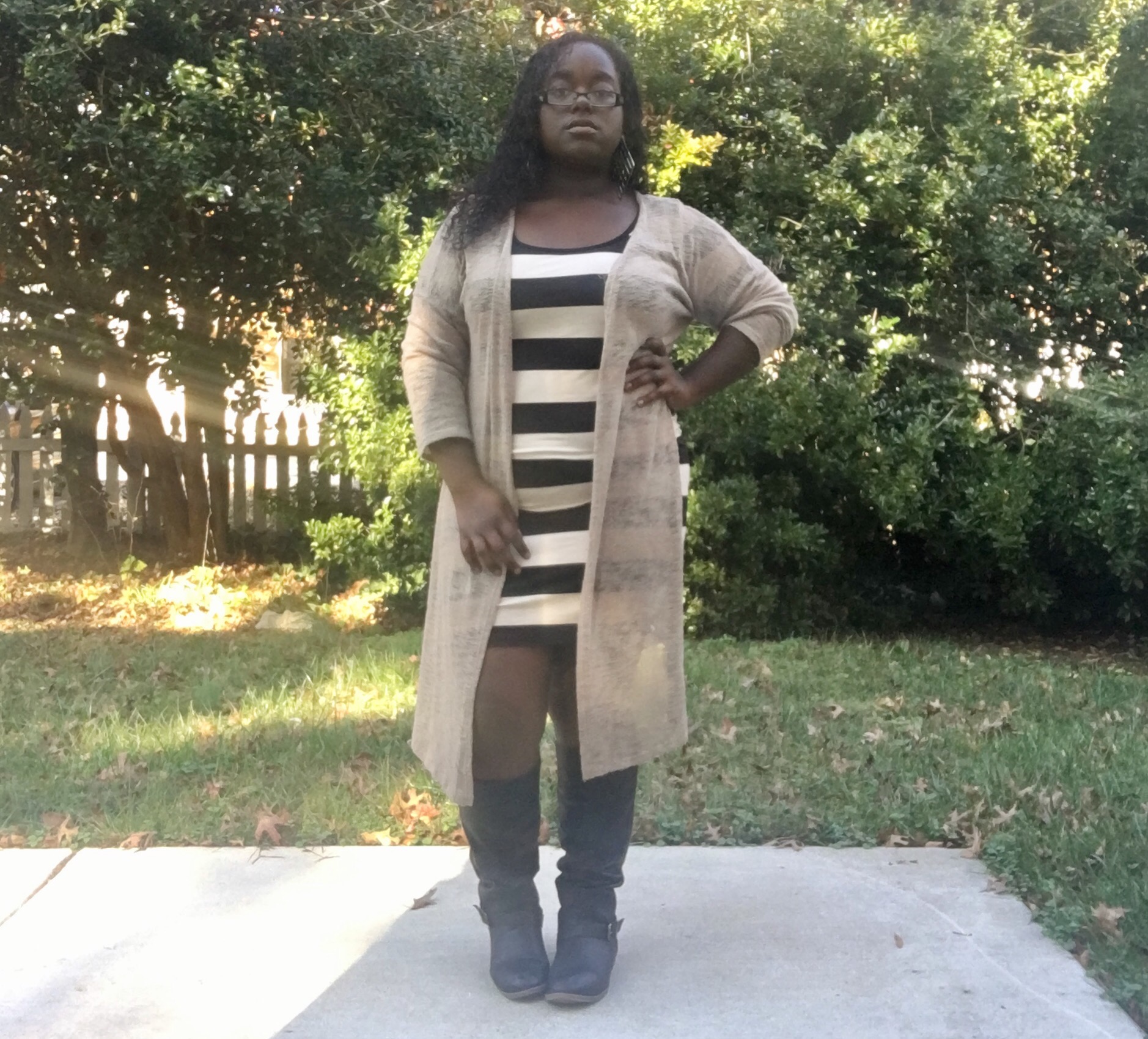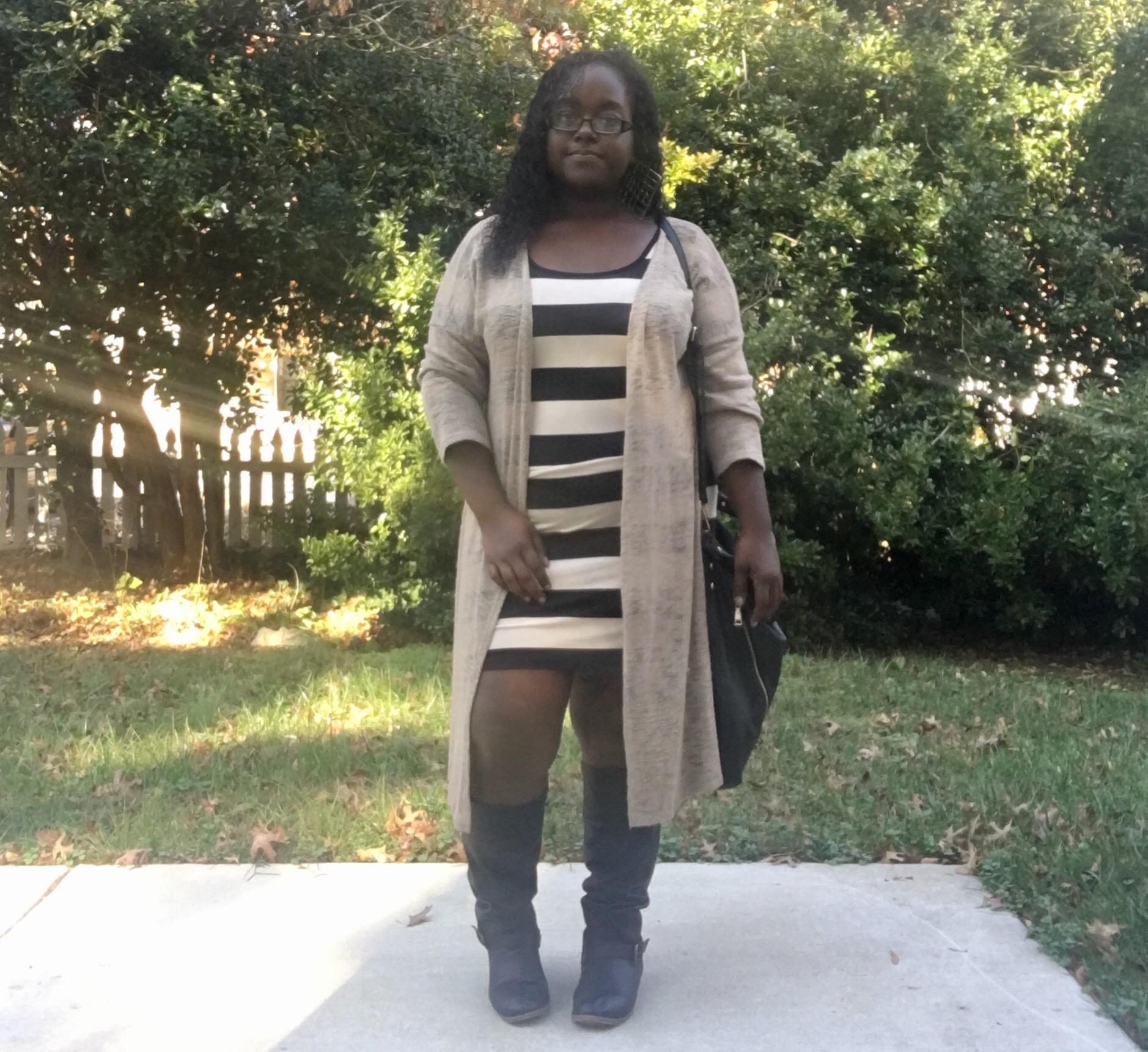 Who would I be if I didn’t wear a cardigan with the dress? Of course my bomber jacket would have been good, but I had to give it a break. I would wear my leather jacket with it, but I left it in NC with my best freeennn lol. Any body con dress, plain or with patterns on it, you can do so much and more with them. From casual to dressy and vise versa, DO YOU BOO!