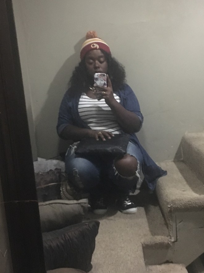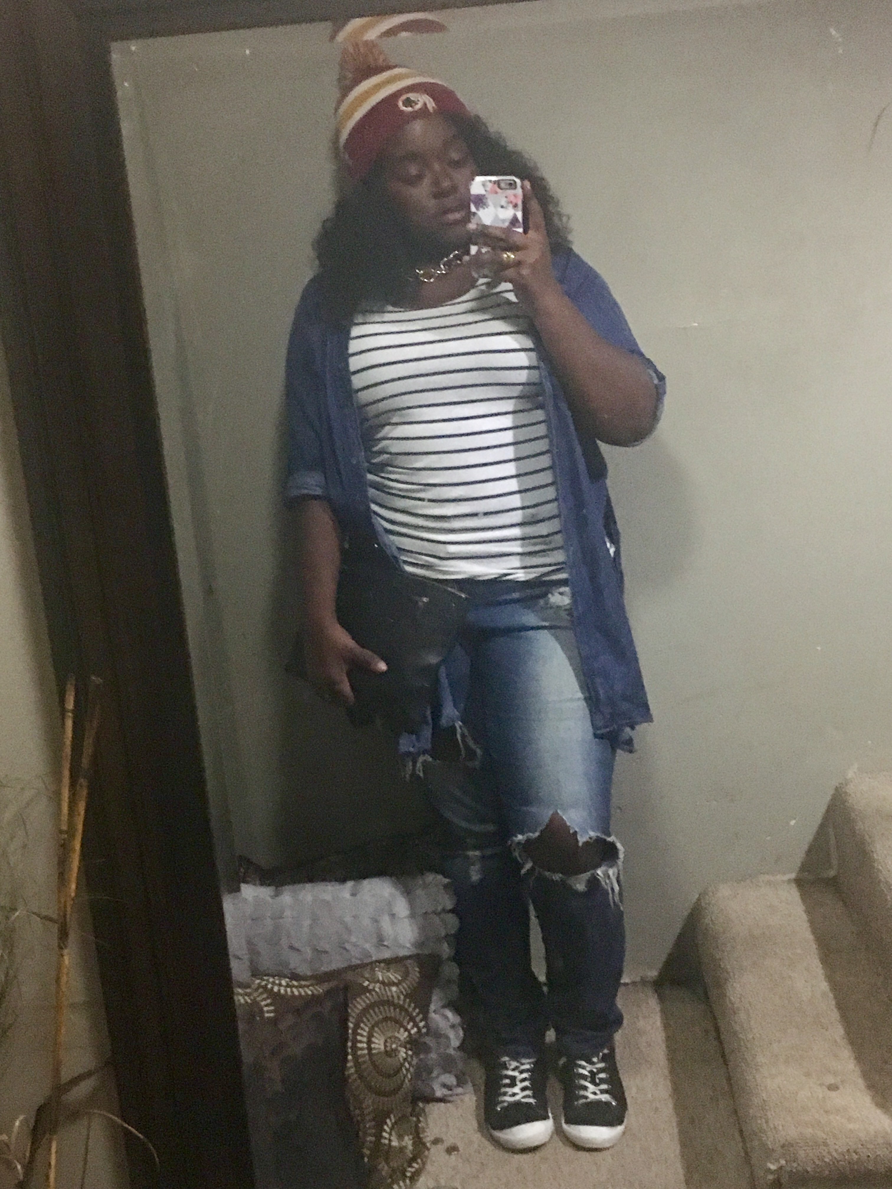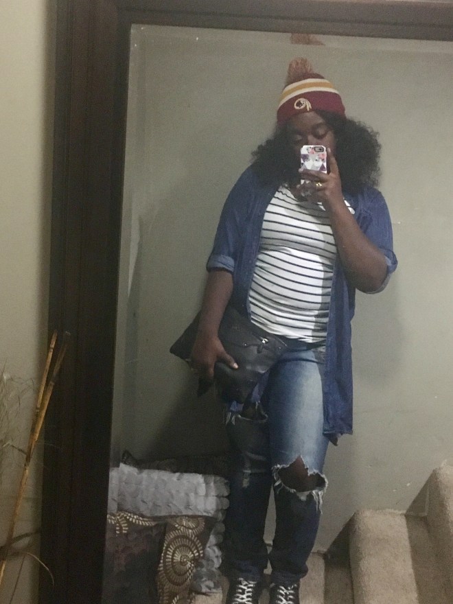 Happy happy holidays from us to you! I hope that you ate all the turkey & Mac n cheese that you could. I know I’ve had enough for me and a few of you, just without the Mac n cheese. On Thursday, of course I was comfortable and cute. Classic denim on denim w/ a hint of stripes & a Redskins hat to rep my team. Just take a look for yourself: