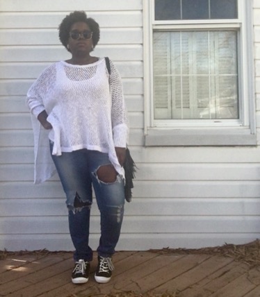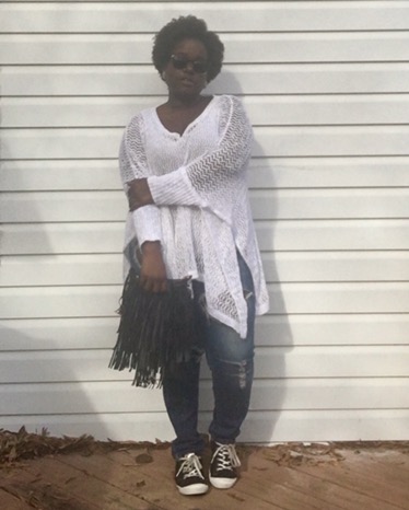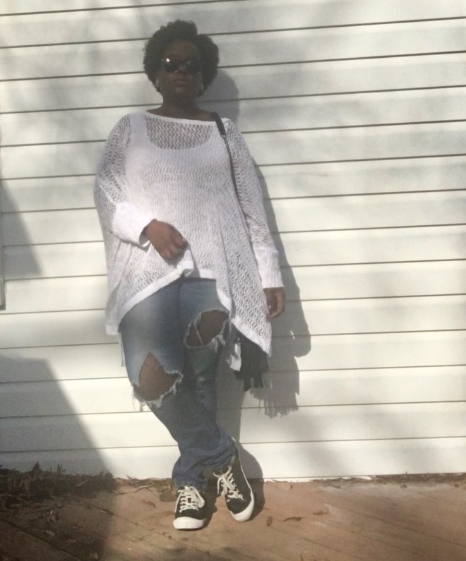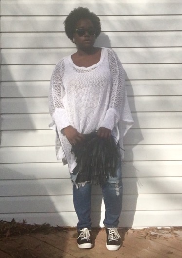 As always, comfort is a major key in my daily looks. This white crochet poncho was the way to go on this day. With the sun out and a cool breeze, I believe I won on this day. The top is very loose and has sleeves!!! Not only can this top be worn during the odd winter days, but it can also be worn as a cover up for when I decide to go to the beach or somebody’s pool this summer.