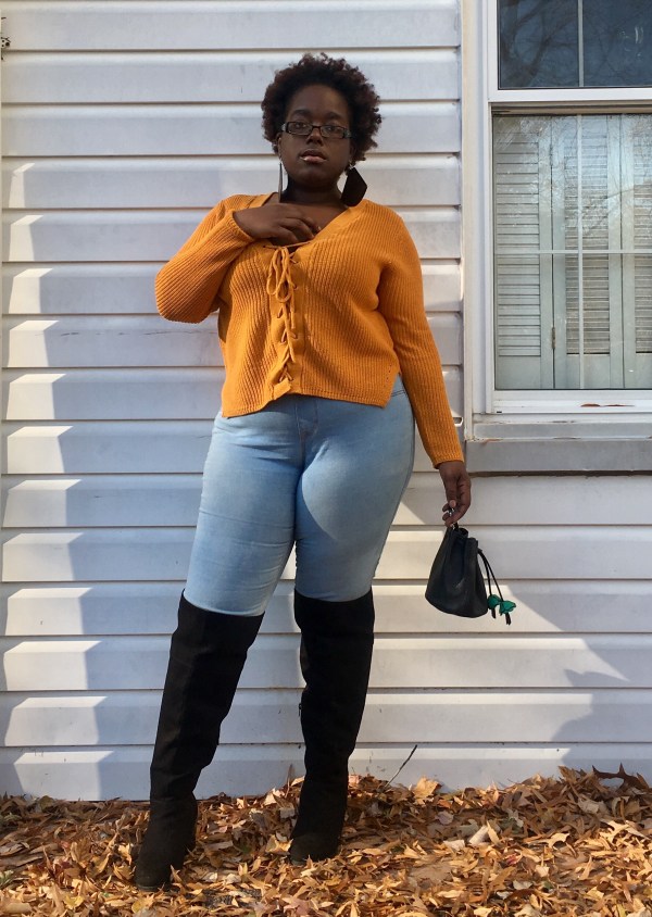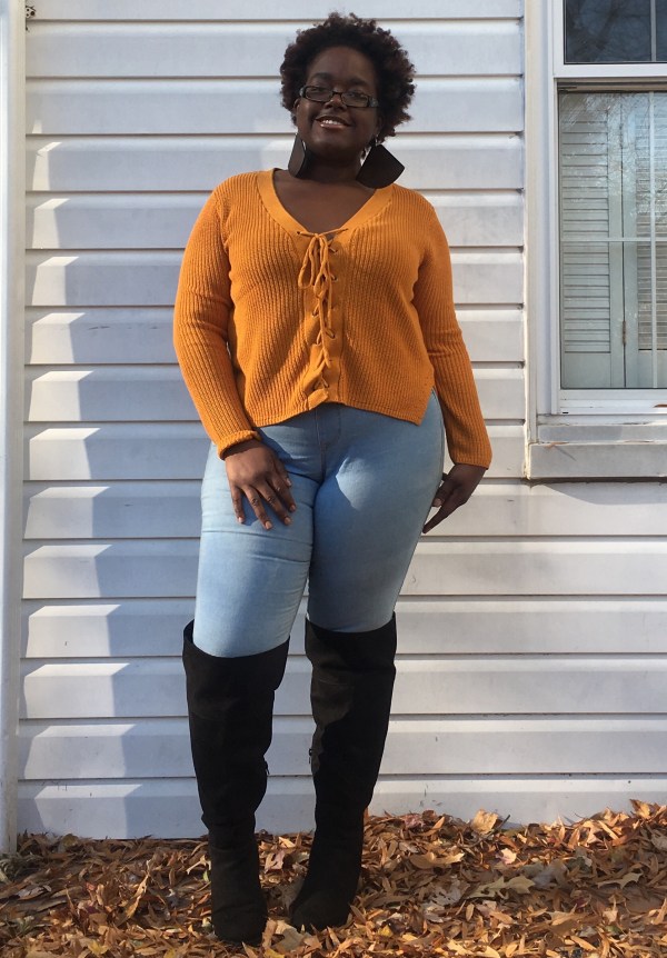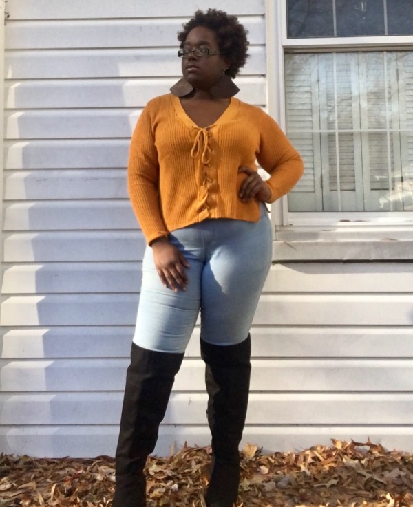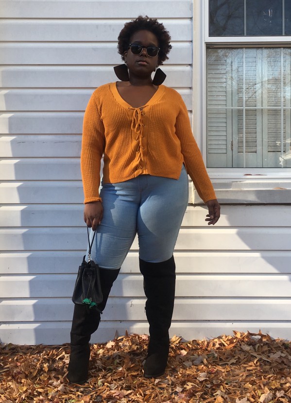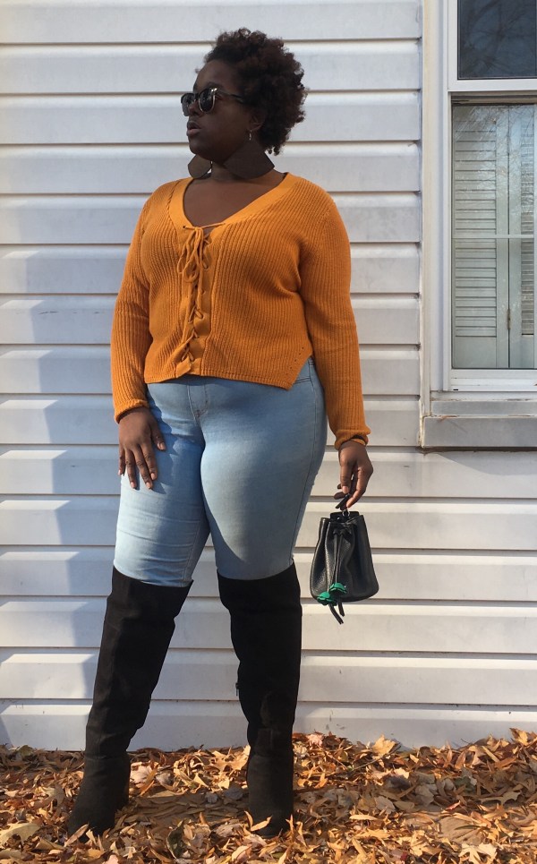 While I was at work I had saw one customer with this beautiful cropped yellow sweater and I had to tell her how good she looked in it. I asked where did she get it from and she told me Forever 21. I didn’t expect to find that exact one when I decided to go, but I knew I had to find something like it. When I got into the store the entire plus size section was empty! So I saw it as open field for me to take my time (even though I was on my lunch break) to find the sweater or anything else that would catch my attention. This beauty stood out like no other. I knew for a fact that not only that I was going to get it, but I knew this color would look AMAZING on my skin.
