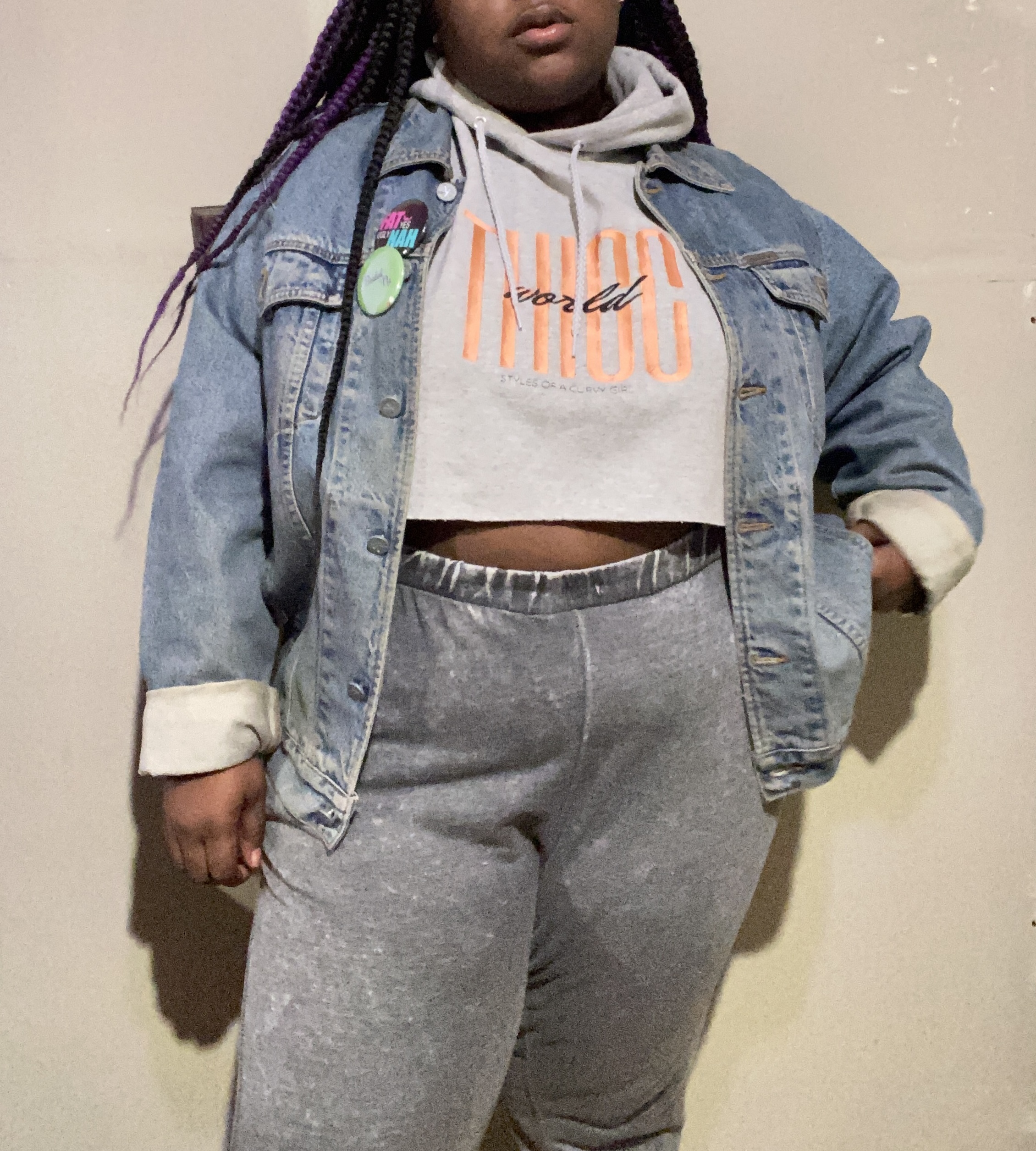 Wednesday and Thursday were my chill days. I wore a cropped hoodie (i cut it before I put it on) with sweats and a jean jacket. That was probably my most comfortable fit since I started this challenge.