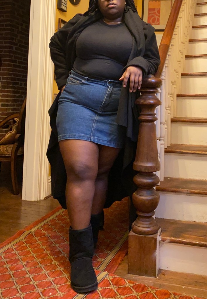 Friday was a slight struggle for me because everything I put on was not agreeing with me. You know how you think a fit would work in your mind, but as soon as you put it on, it’s a flop. That’s exactly how my day started. I eventually decided on a black bodysuit with puff sleeves (so hurt I didn’t get any pictures without my coat) and my mini denim skirt with my Ugg boots. I had tights, but of course, those ripped. I told you I was having a DAY before I could even leave my room. I’m glad I pulled my trench out because it kept my poor bare legs warm.