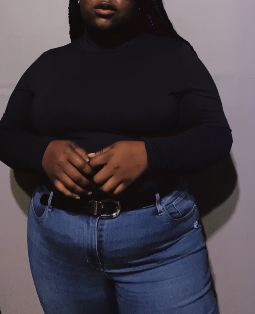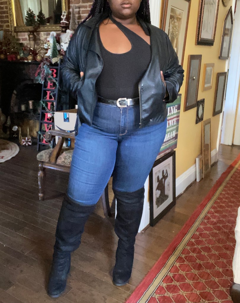 I’ve been eyeing these one-shoulder cut out tops, and I felt like my body deserved. Of course, I’m not doing any shopping right now, so I had to make my clothes work for me. Tuesday, I wore a regular tank top bodysuit and put one of the straps over my head to give it the one-shoulder cut out look. I felt like the baddest b*tch that day. The boots, the leather jacket, and the top did it for me. I plan to get more creative as this challenge goes on because of this look.