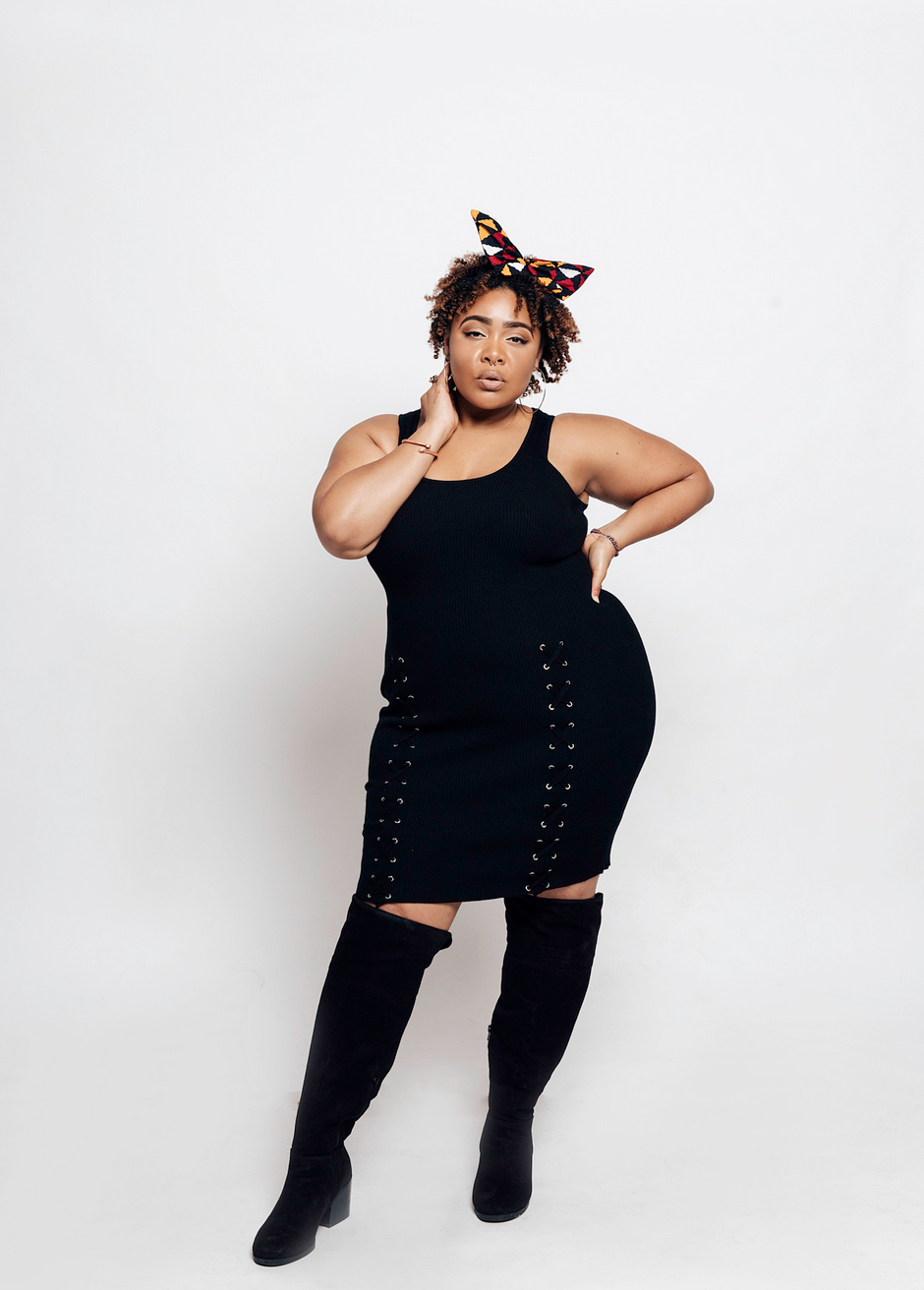 You can never have too many black dresses. Allow me to show you the ways of our very own LBD, Lace Me Up. You can style this dress and dresses like it with a long sleeve top, turtleneck, a bodysuit with dramatic sleeves, or a collared shirt like I did here. When it comes to little black dresses they allow you to do so much with them. Accessories are key!