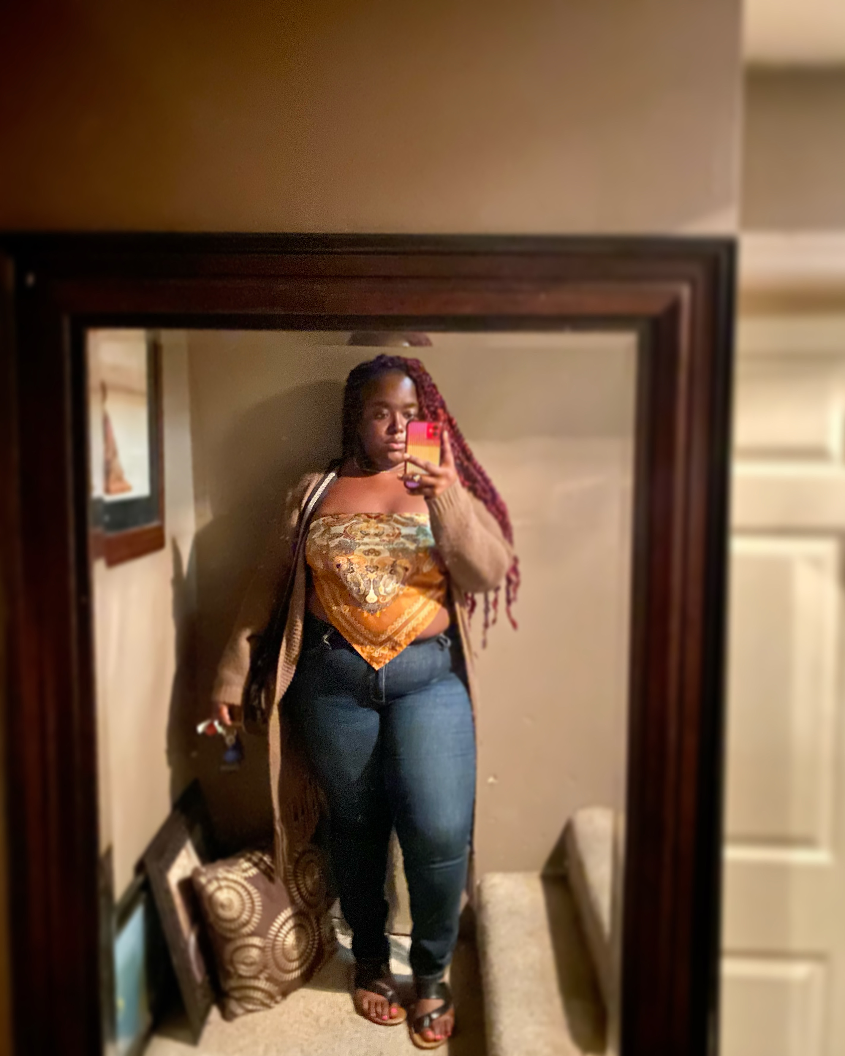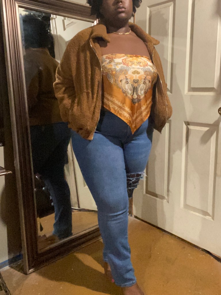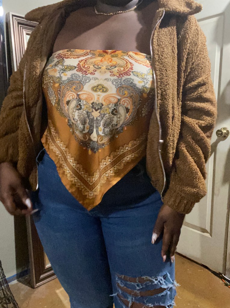 Let’s Take a Trip is a piece that most people won’t wear the minute the weather changes, and I know exactly why. The potential to get cold the minute the cool wind hits you will send you back in the house to change. To settle that I have worn our scarf top with a duster and my teddy jacket. Each piece I have layered this top with is cozy enough to keep on and not have to worry about taking it off because it’s too hot.
