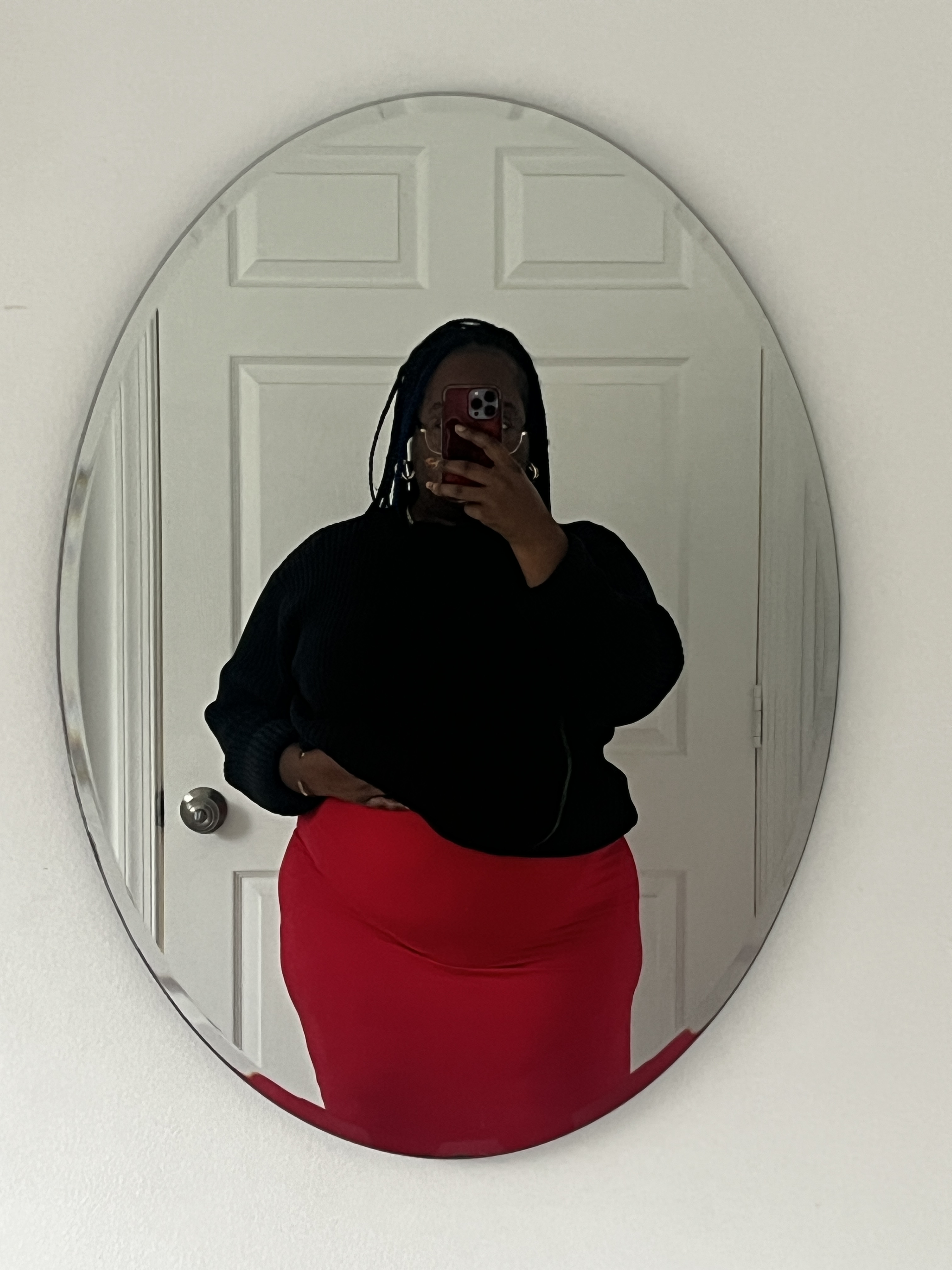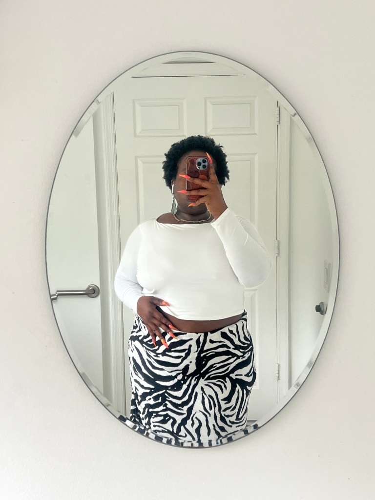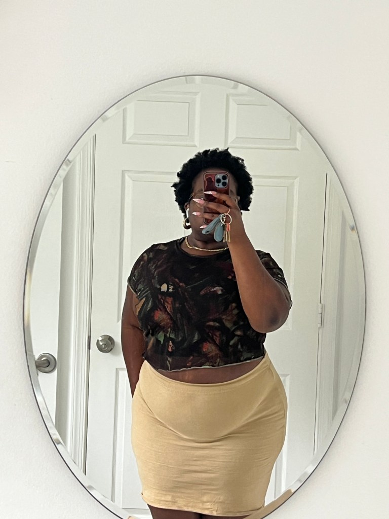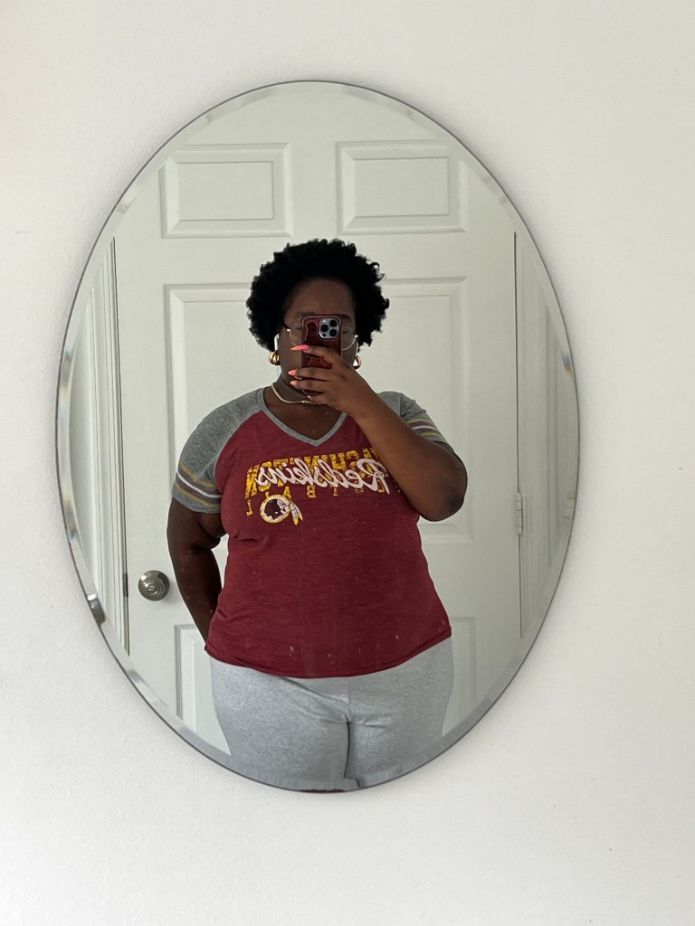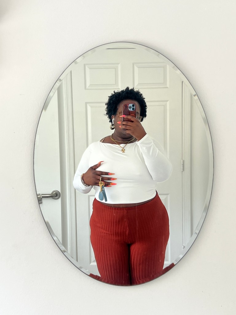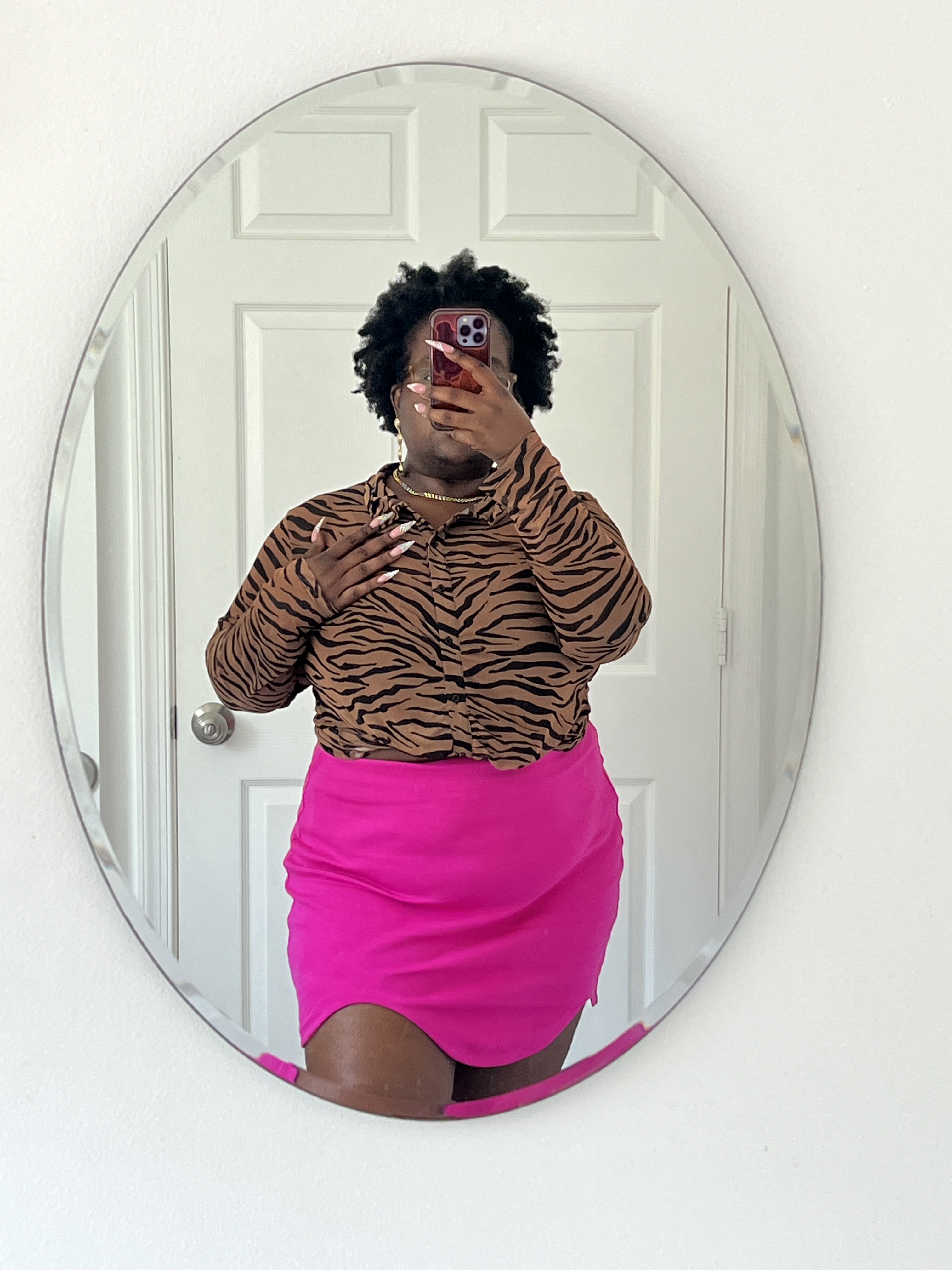 It took me a minute to find the right spot to capture each look. At first it was in the mirror in the weight room, but then they converted that room into another office space. I then took my talents back to the office, but I didn’t want everybody in my business. One day I was doing my rounds, and I went into our community room and completely forgot about the bathroom in there. It was enough space, perfect lighting and a mirror that caught my fit just right. I even could get a quick video done with a few turns and lookbacks. Once I started taking my pics in there I realized that I was getting more engagement from my followers and even gaining a few new babes. That let me know I was on the right track.