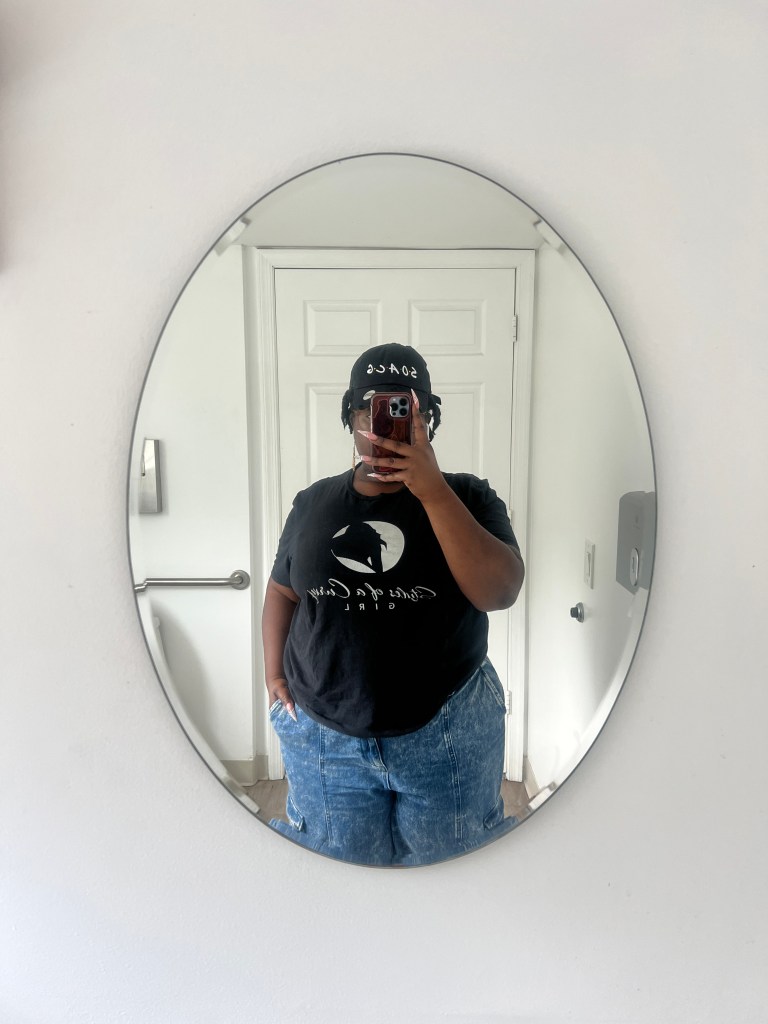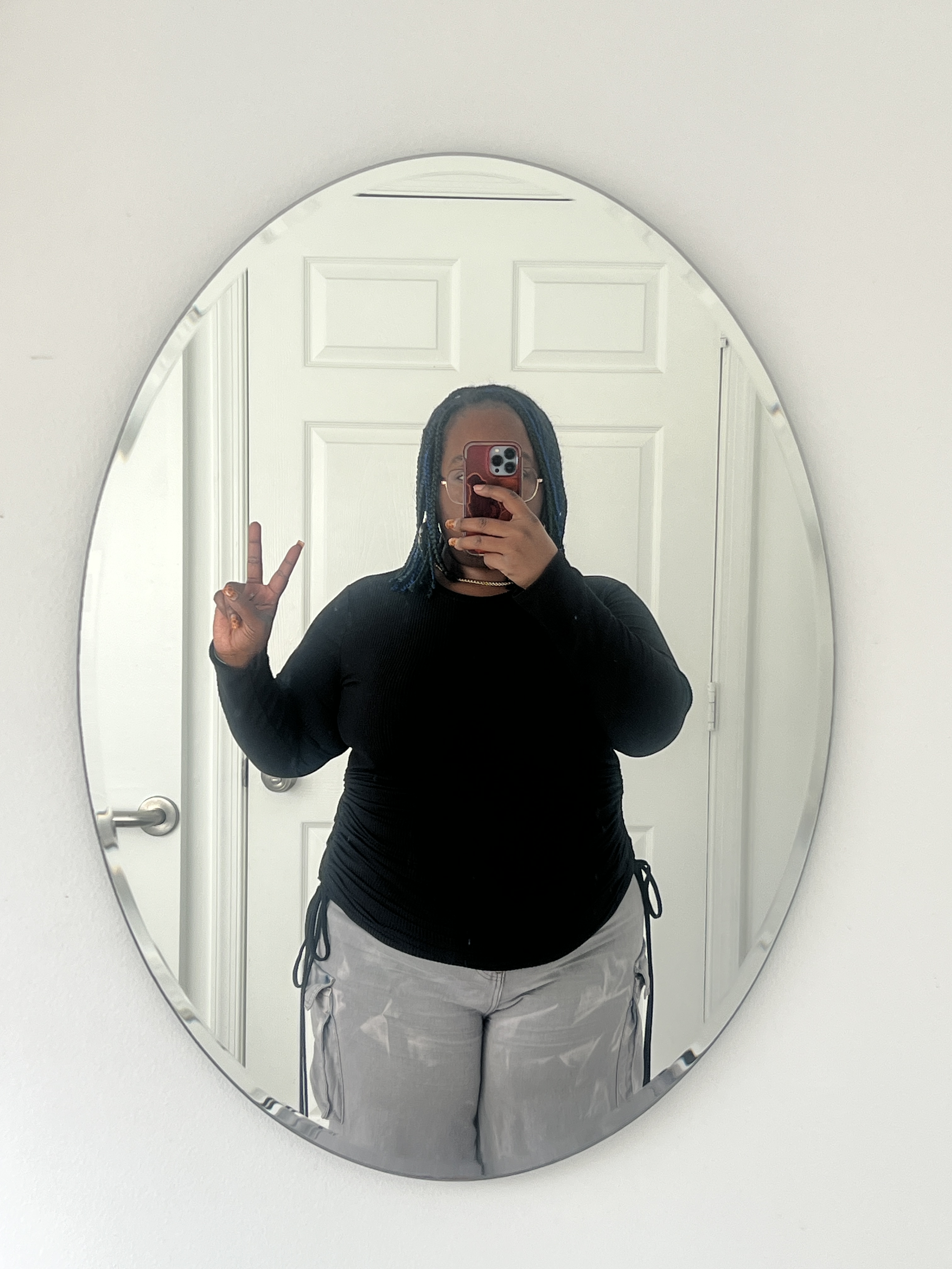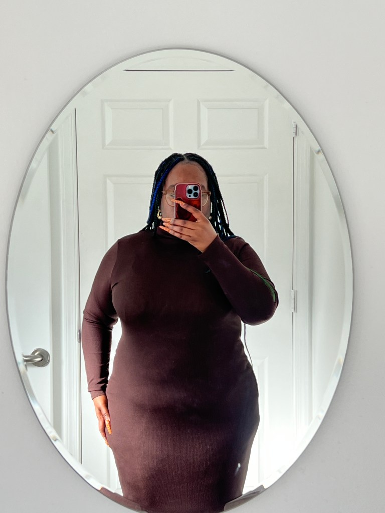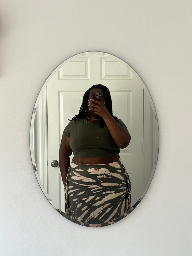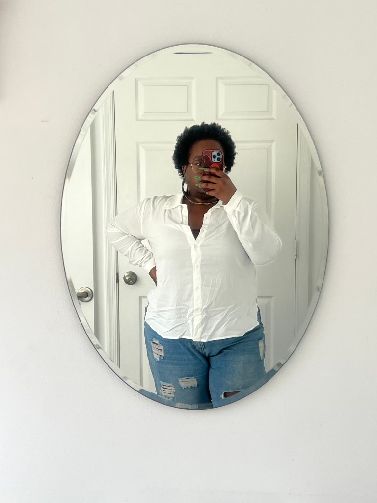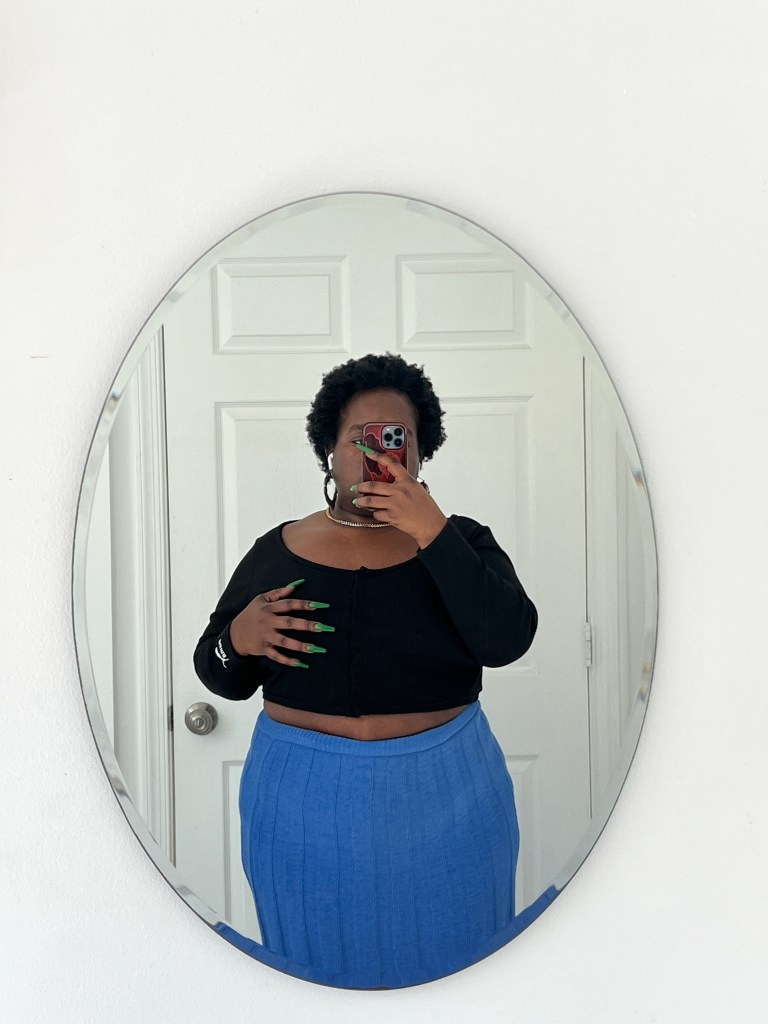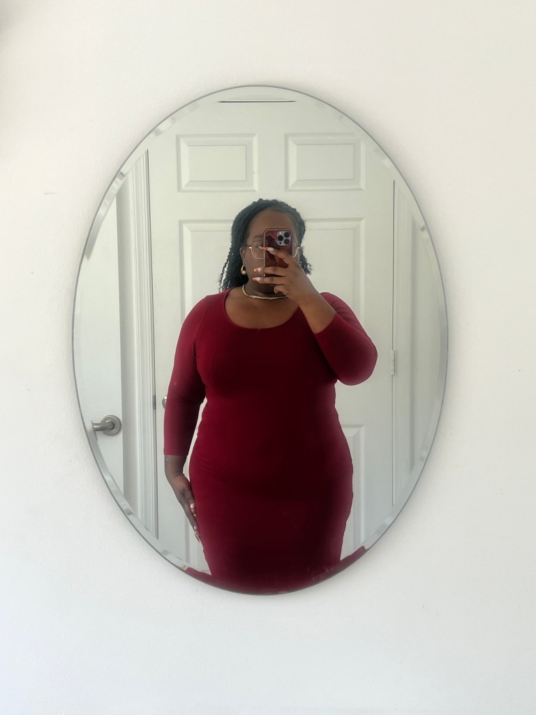 It took me a minute to find the right spot to capture each look. At first it was in the mirror in the weight room, but then they converted that room into another office space. I then took my talents back to the office, but I didn’t want everybody in my business. One day I was doing my rounds, and I went into our community room and completely forgot about the bathroom in there. It was enough space, perfect lighting and a mirror that caught my fit just right. I even could get a quick video done with a few turns and lookbacks. Once I started taking my pics in there I realized that I was getting more engagement from my followers and even gaining a few new babes. That let me know I was on the right track.