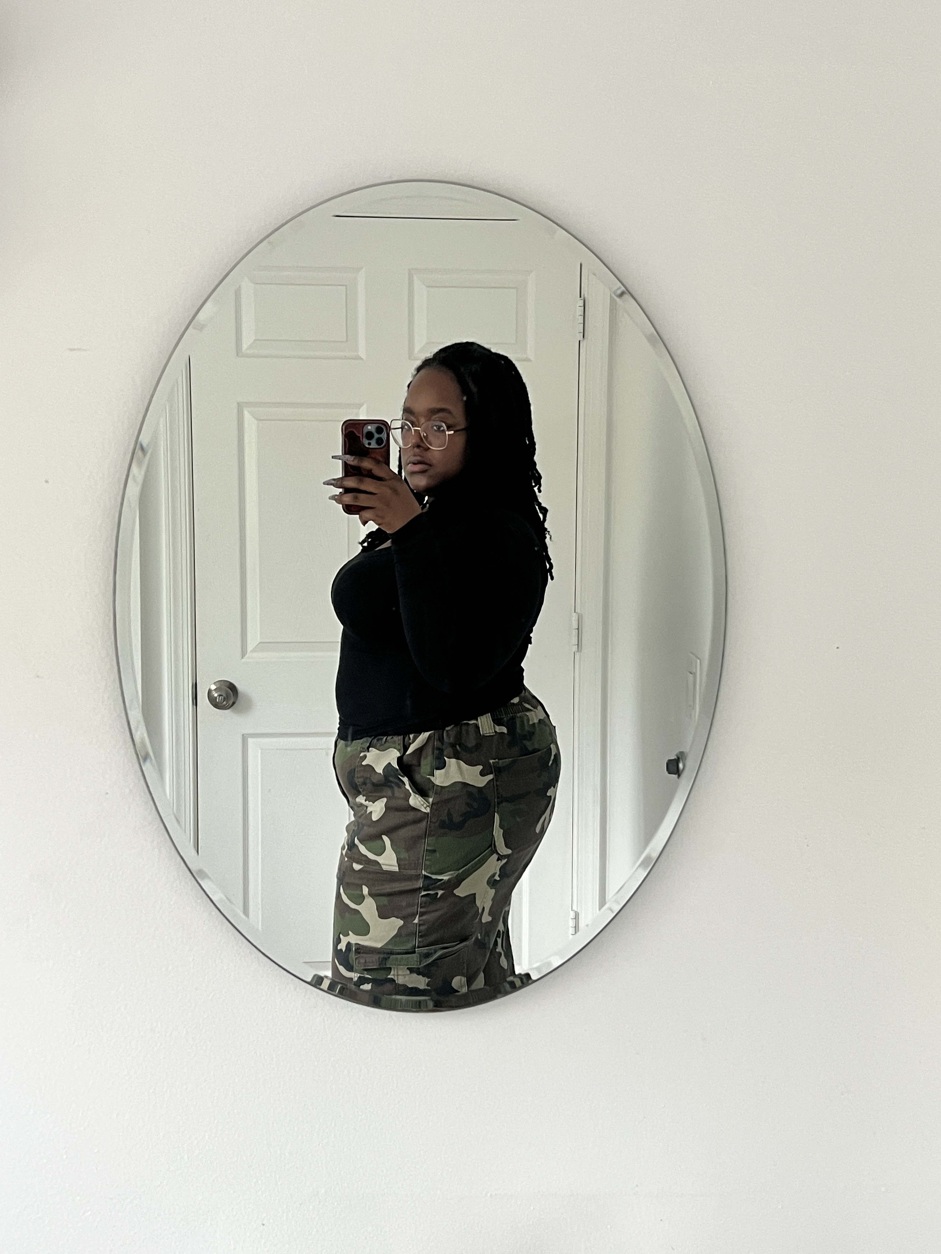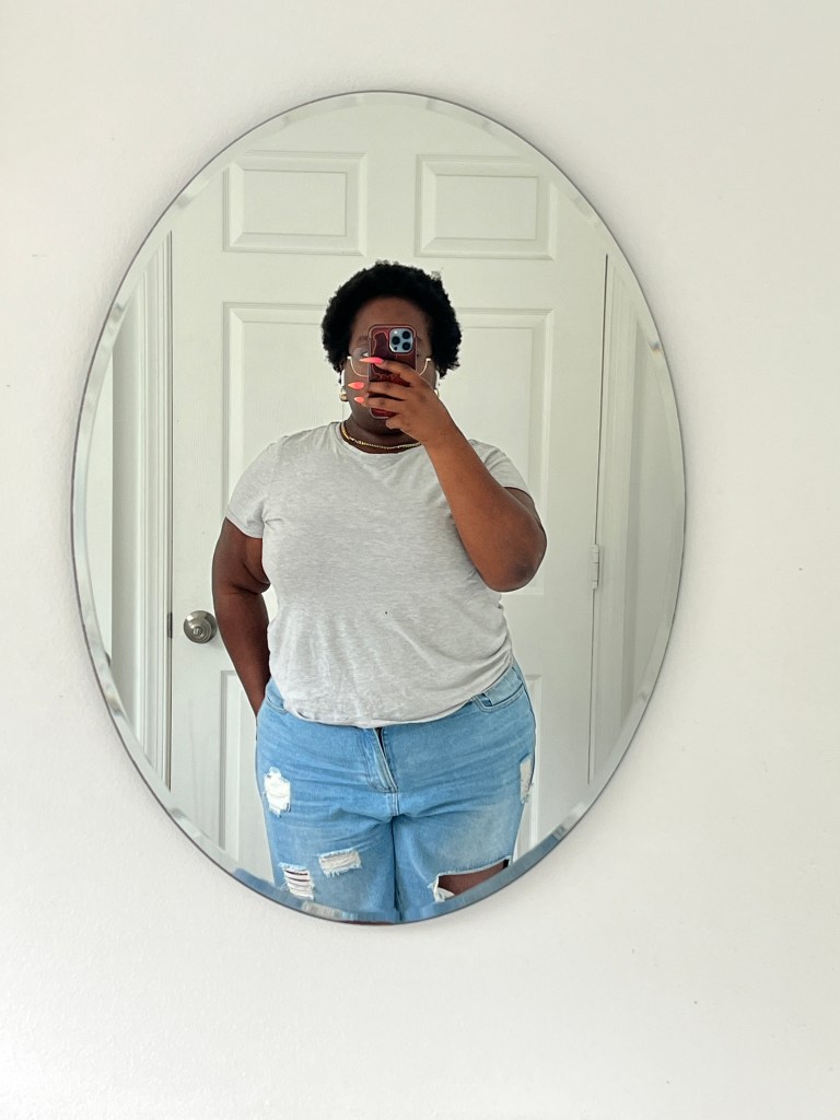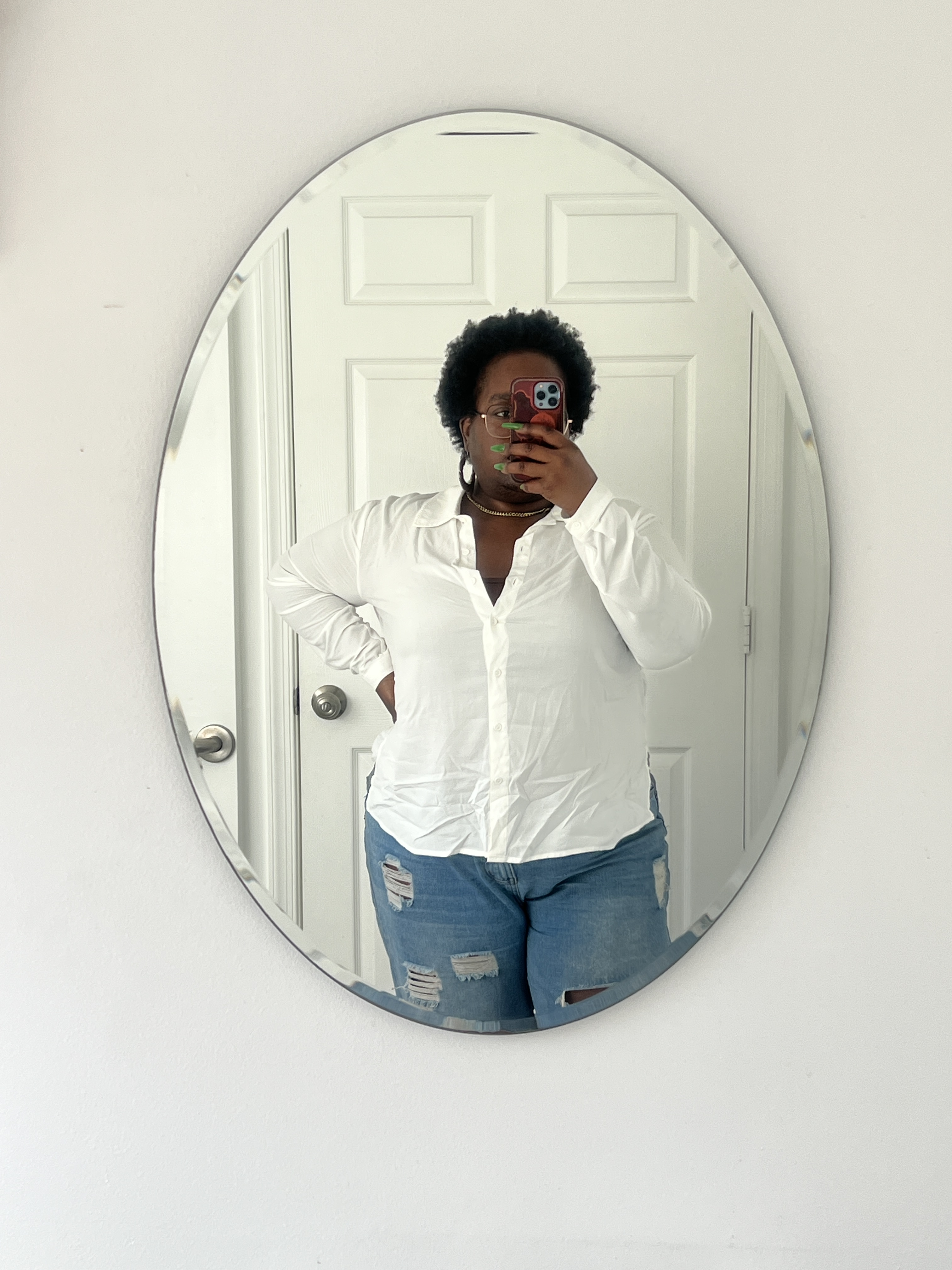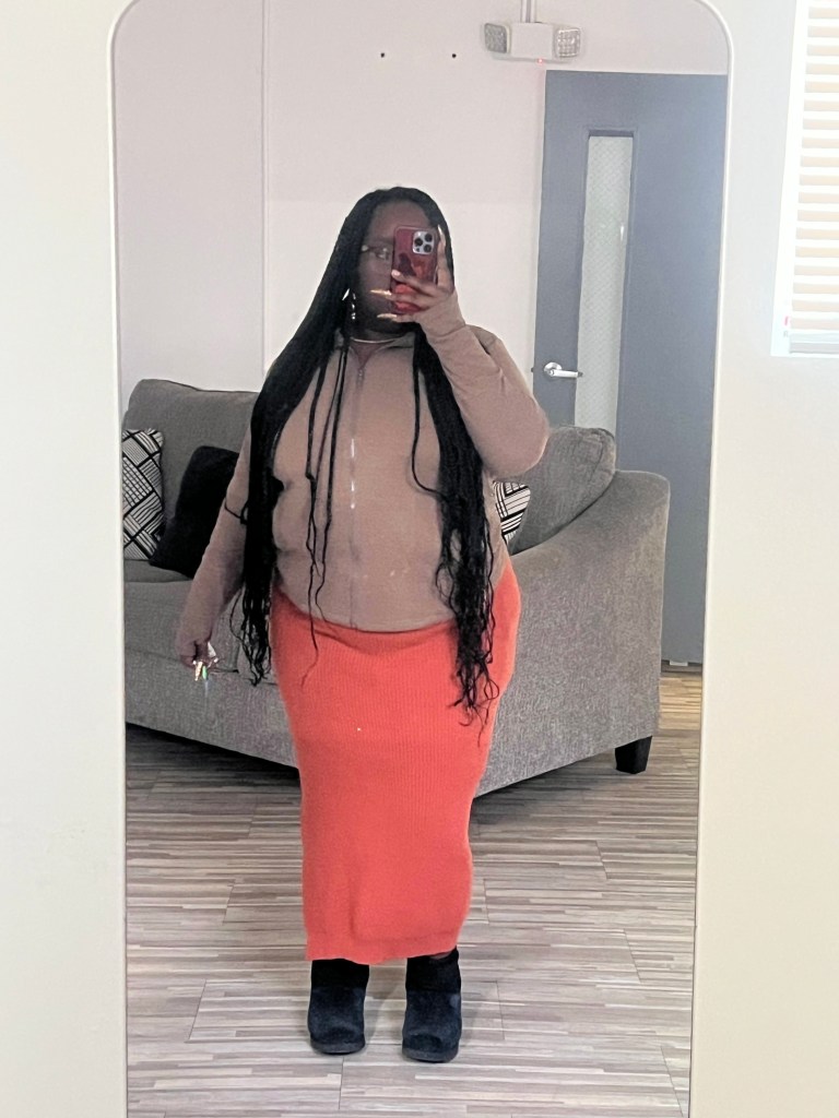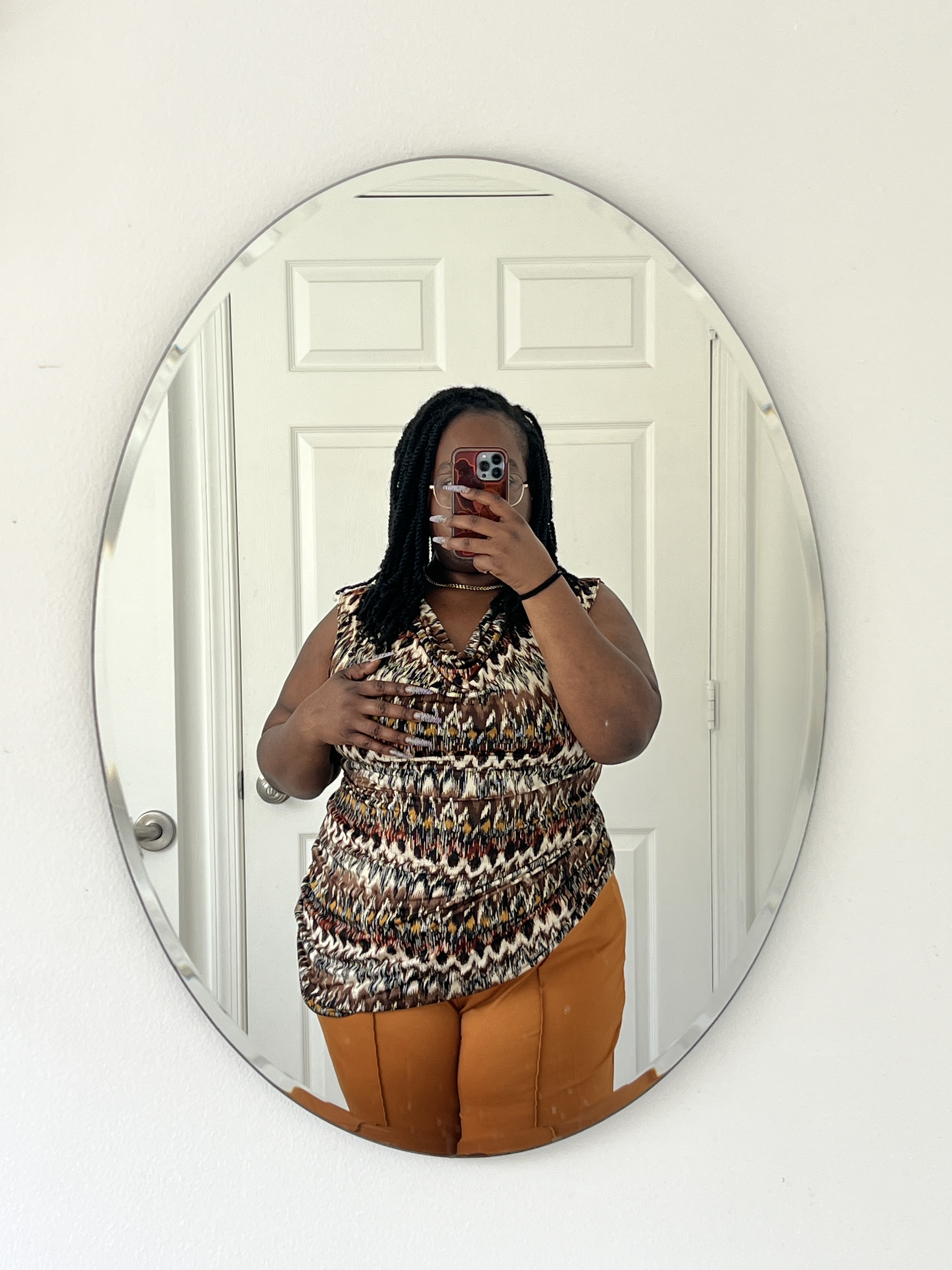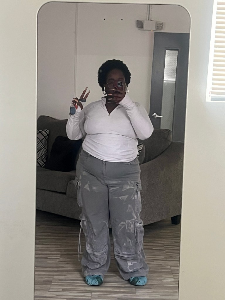 It took me a minute to find the right spot to capture each look. At first it was in the mirror in the weight room, but then they converted that room into another office space. I then took my talents back to the office, but I didn’t want everybody in my business. One day I was doing my rounds, and I went into our community room and completely forgot about the bathroom in there. It was enough space, perfect lighting and a mirror that caught my fit just right. I even could get a quick video done with a few turns and lookbacks. Once I started taking my pics in there I realized that I was getting more engagement from my followers and even gaining a few new babes. That let me know I was on the right track.