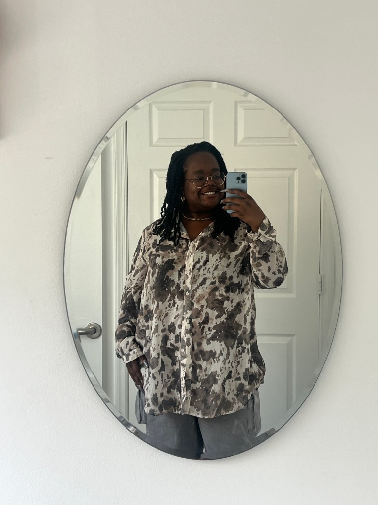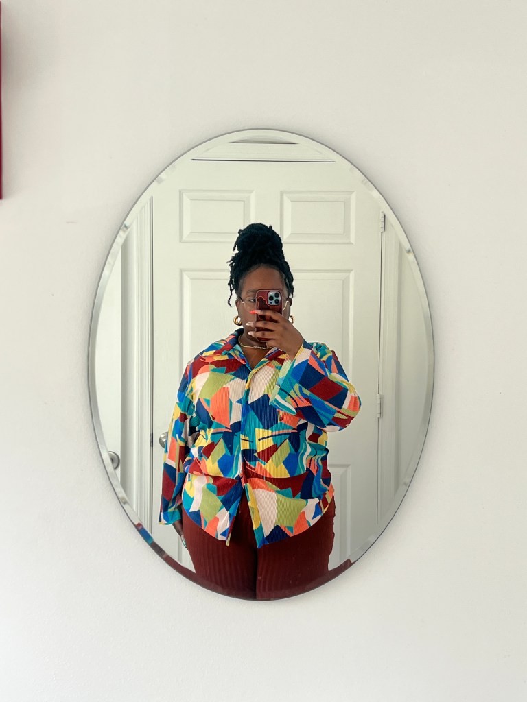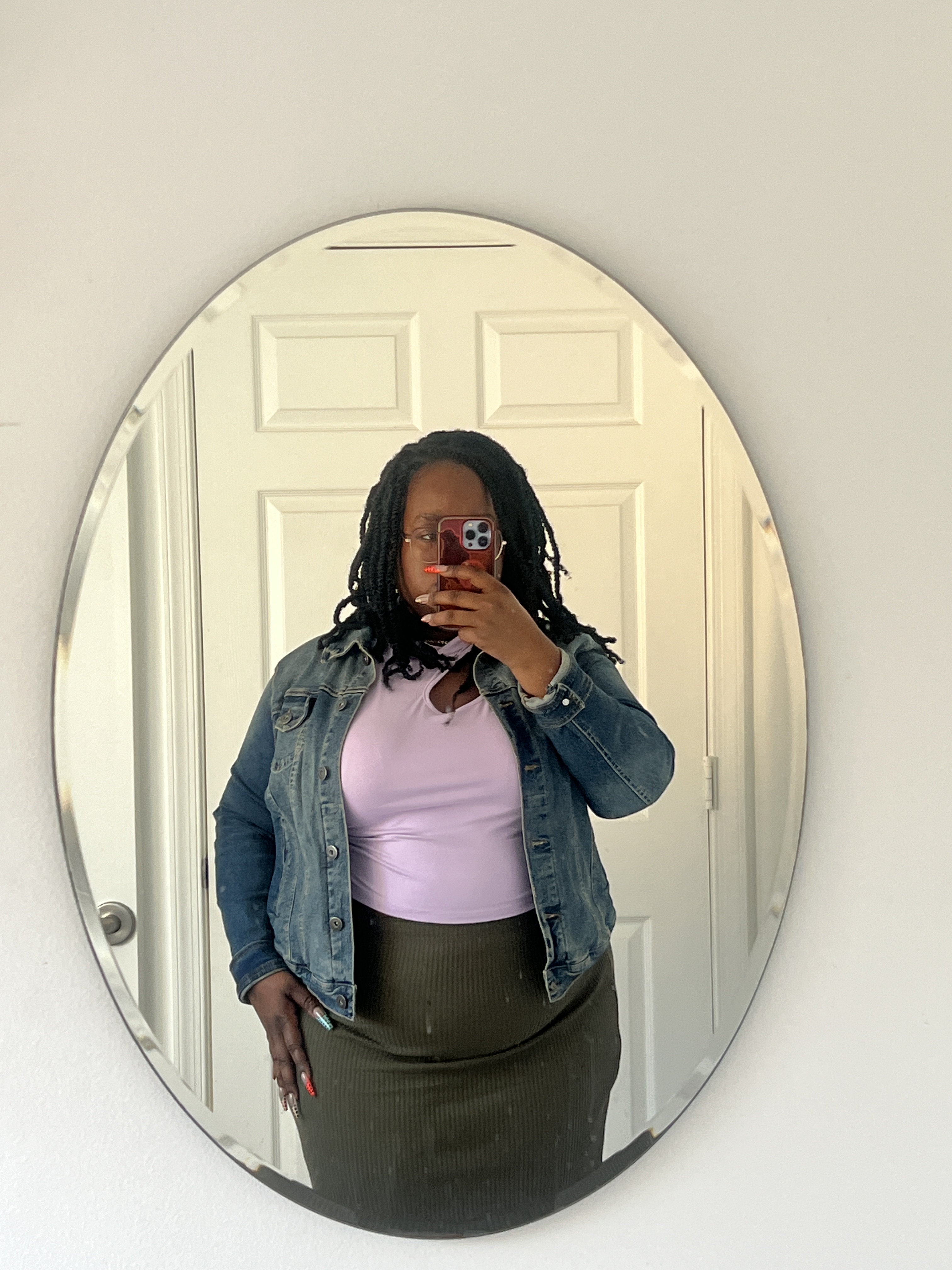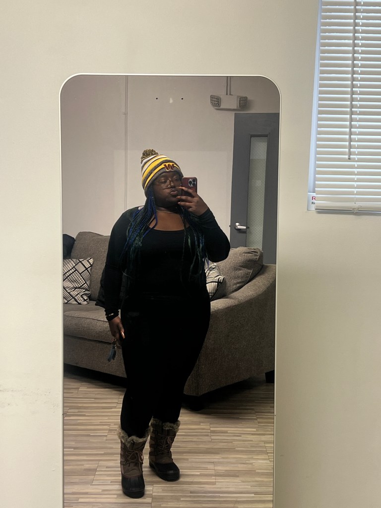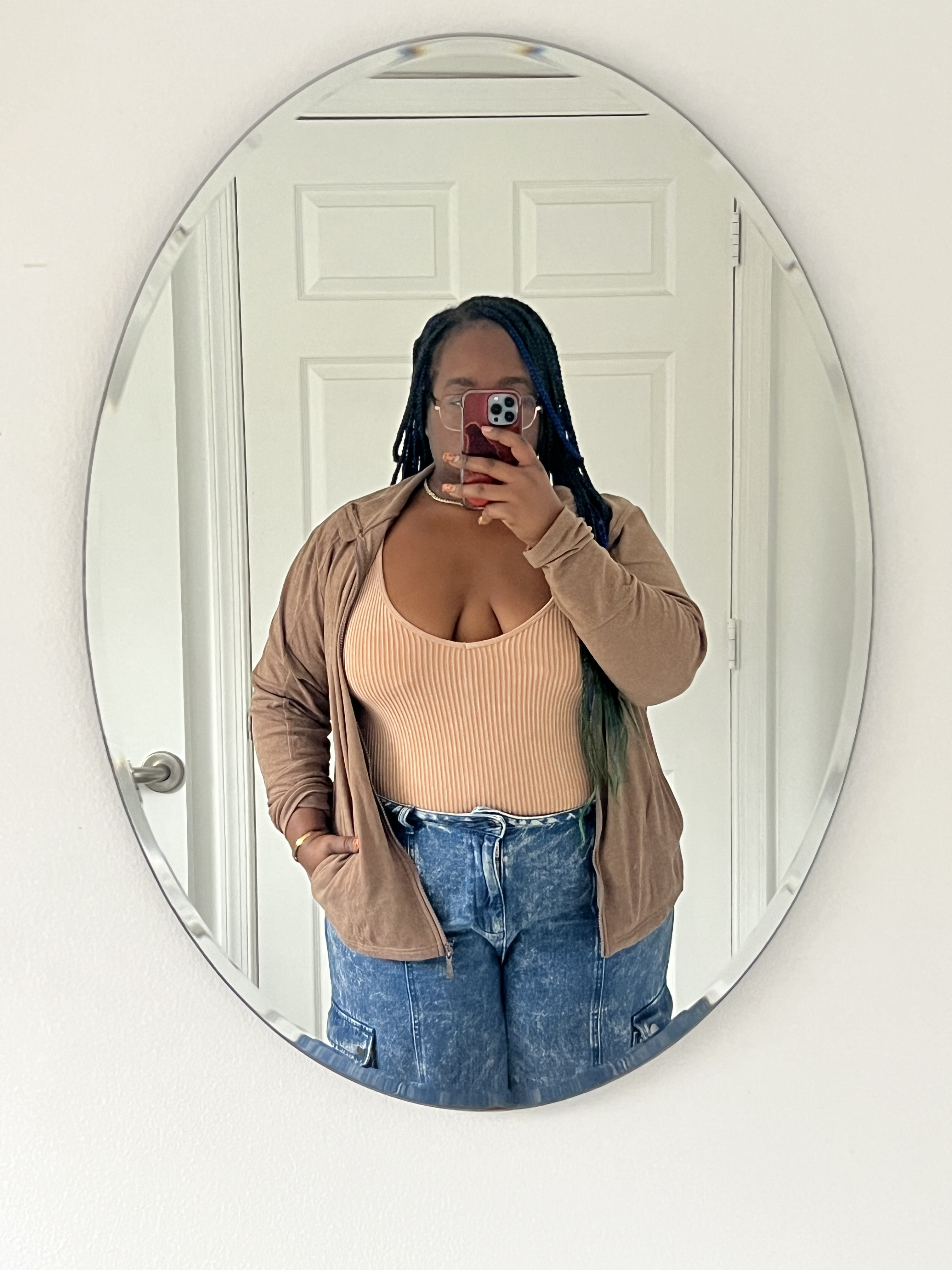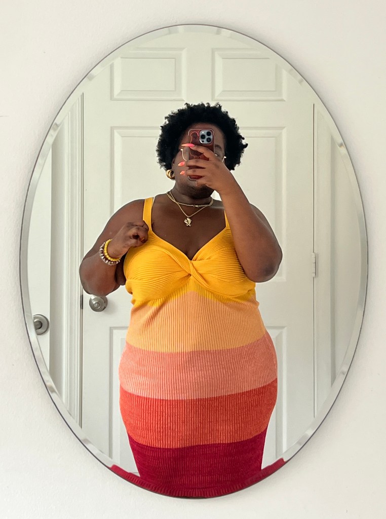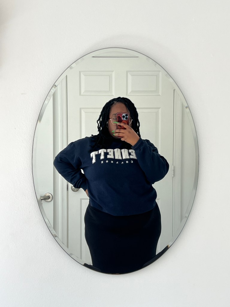 It took me a minute to find the right spot to capture each look. At first it was in the mirror in the weight room, but then they converted that room into another office space. I then took my talents back to the office, but I didn’t want everybody in my business. One day I was doing my rounds, and I went into our community room and completely forgot about the bathroom in there. It was enough space, perfect lighting and a mirror that caught my fit just right. I even could get a quick video done with a few turns and lookbacks. Once I started taking my pics in there I realized that I was getting more engagement from my followers and even gaining a few new babes. That let me know I was on the right track.