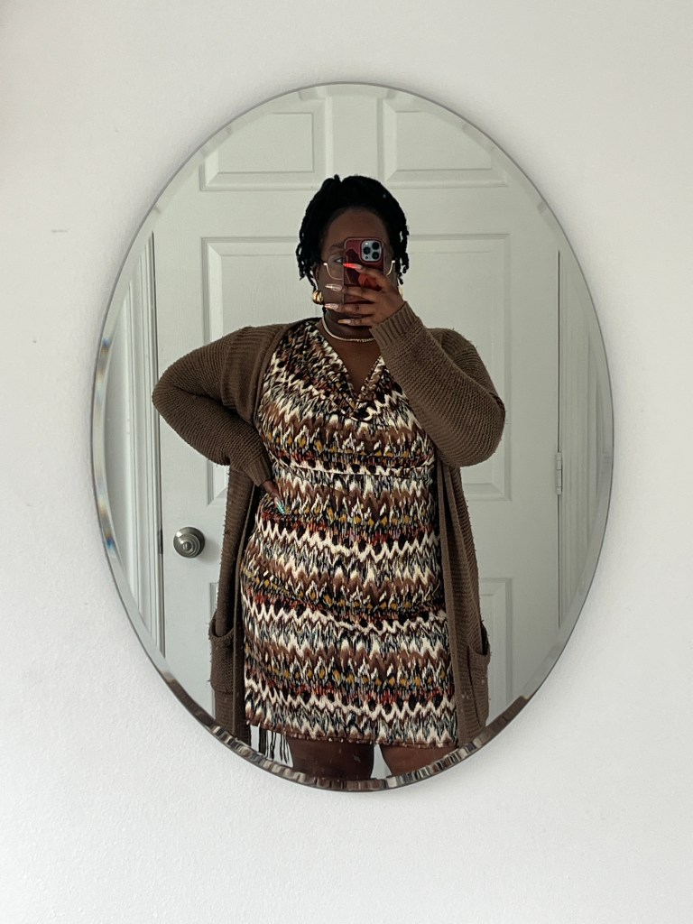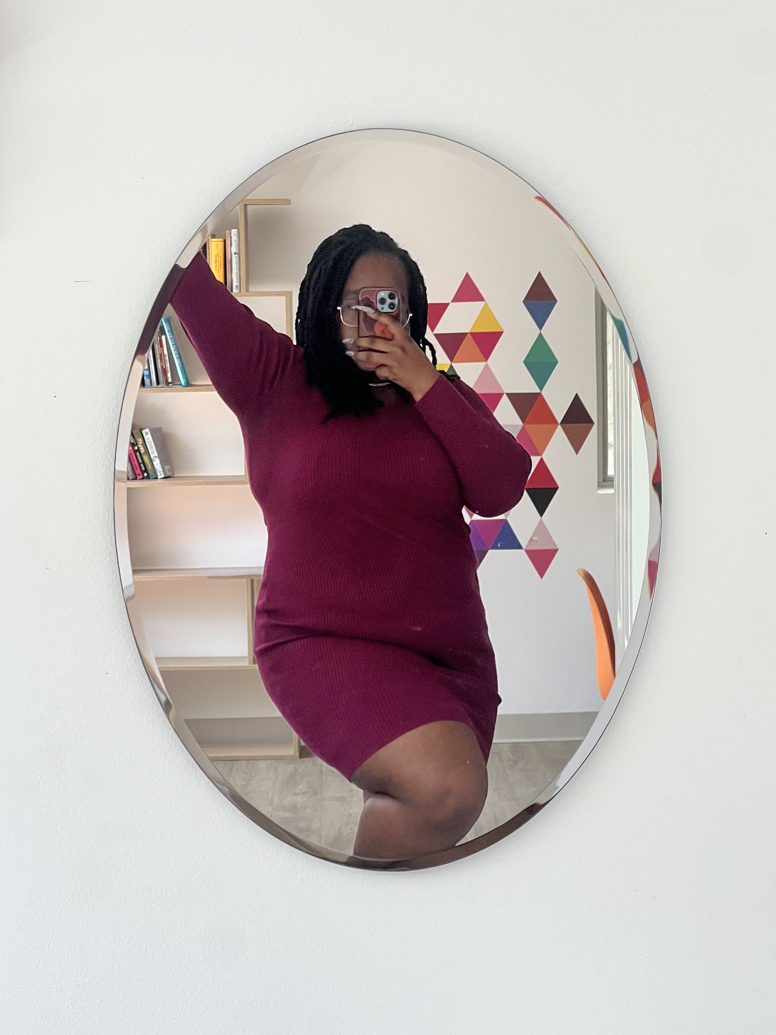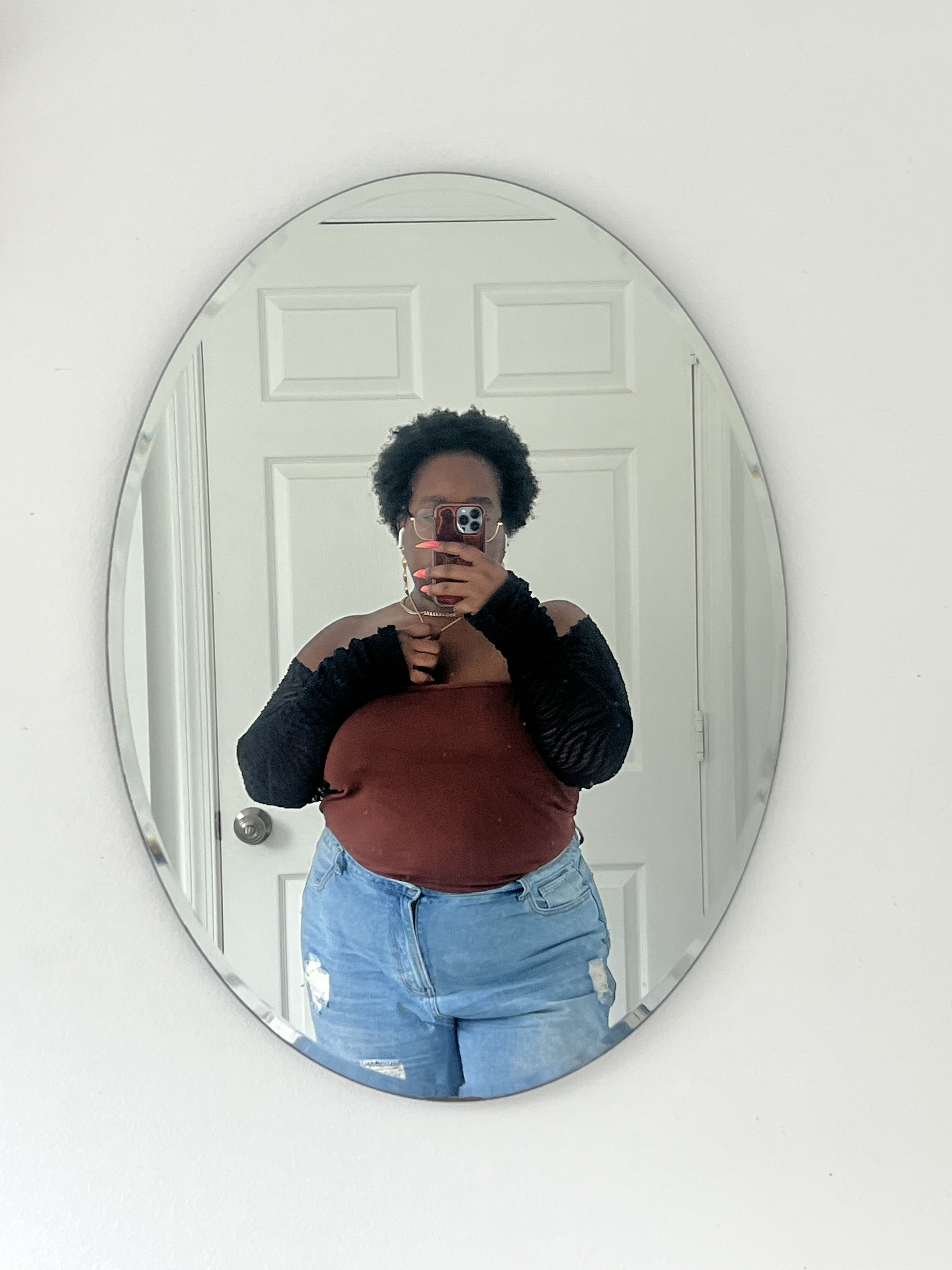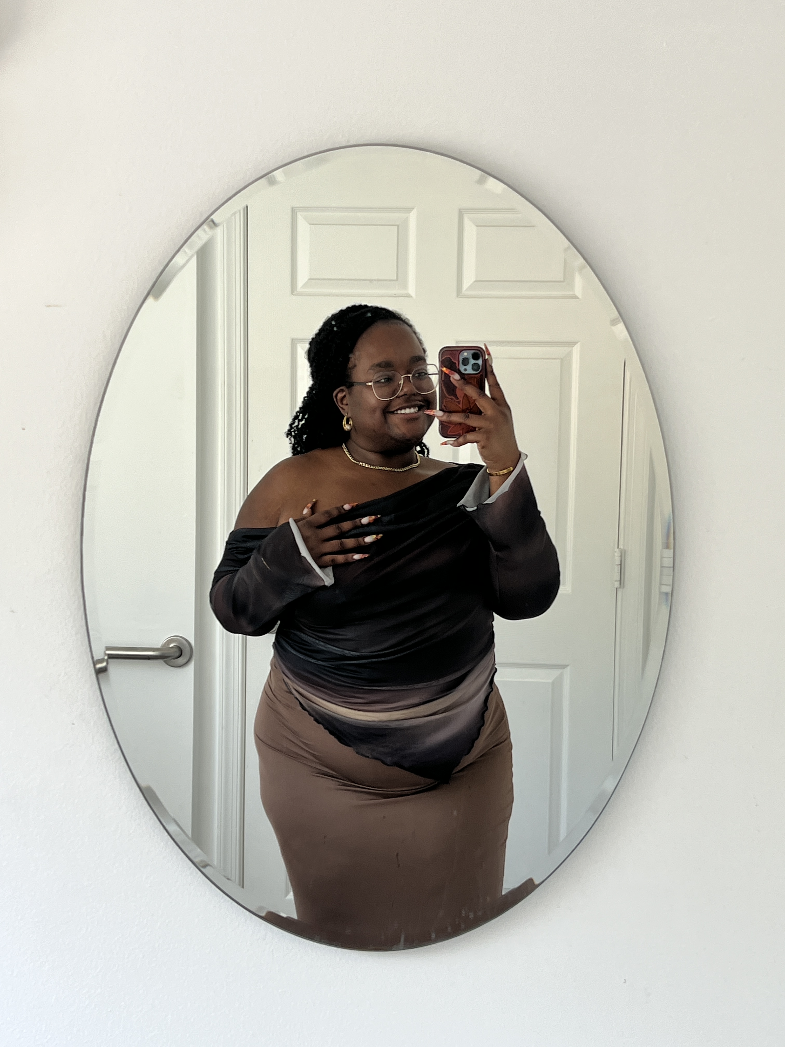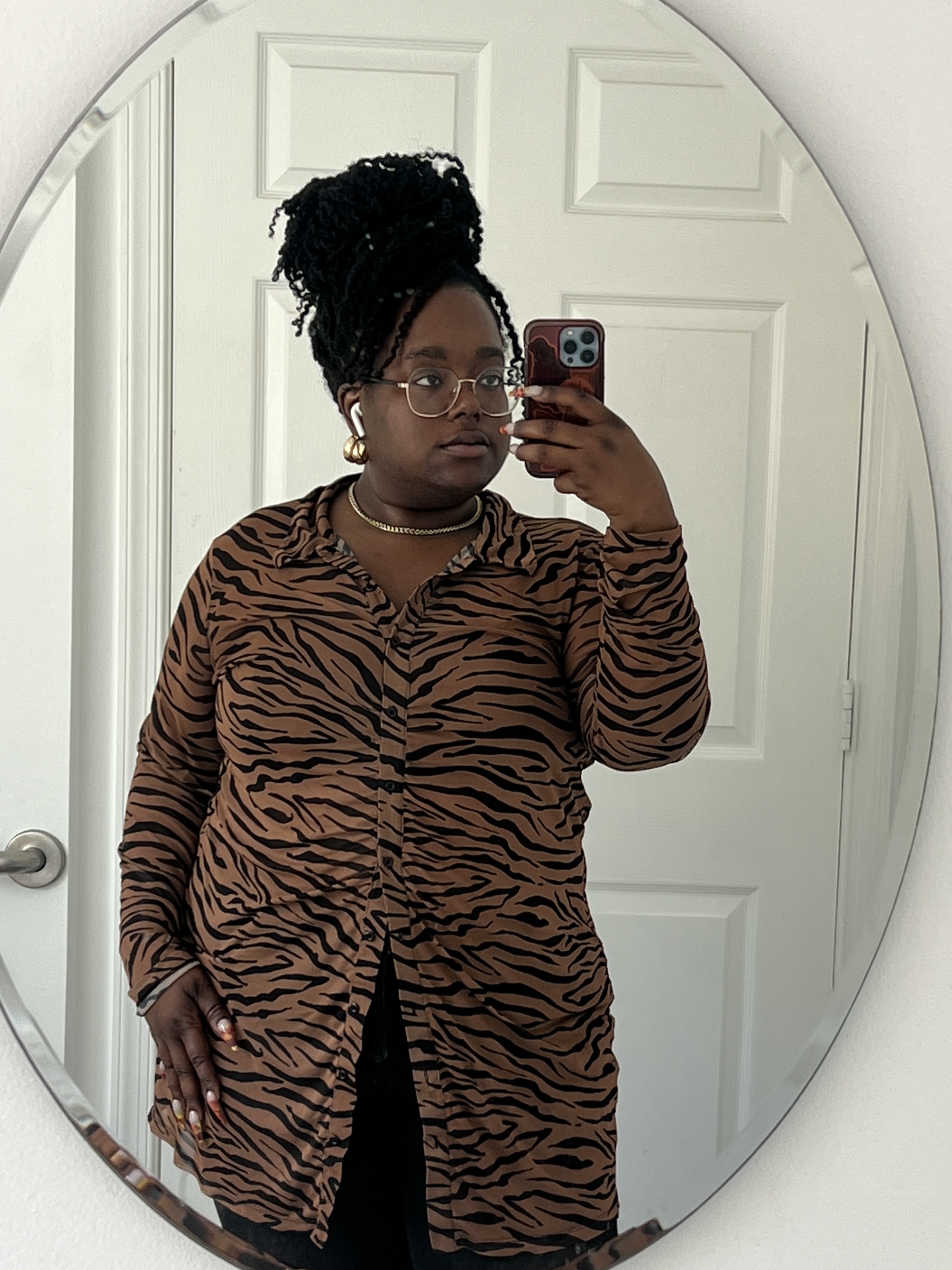 It took me a minute to find the right spot to capture each look. At first it was in the mirror in the weight room, but then they converted that room into another office space. I then took my talents back to the office, but I didn’t want everybody in my business. One day I was doing my rounds, and I went into our community room and completely forgot about the bathroom in there. It was enough space, perfect lighting and a mirror that caught my fit just right. I even could get a quick video done with a few turns and lookbacks. Once I started taking my pics in there I realized that I was getting more engagement from my followers and even gaining a few new babes. That let me know I was on the right track.