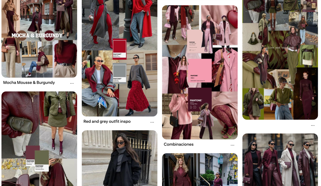Everyone’s loving Mocha Mousse, Pantone’s Color of the Year, but my eye keeps drifting toward Chili Oil + Winterberry and Damson + Mauve Wine. On the runways and in the streets, they’ve shown up paired with bold brights or standing strong on their own. Pinterest hasn’t let me ignore them either. I’ve saved an overflow of looks that prove any shade, any depth of these tones just works.