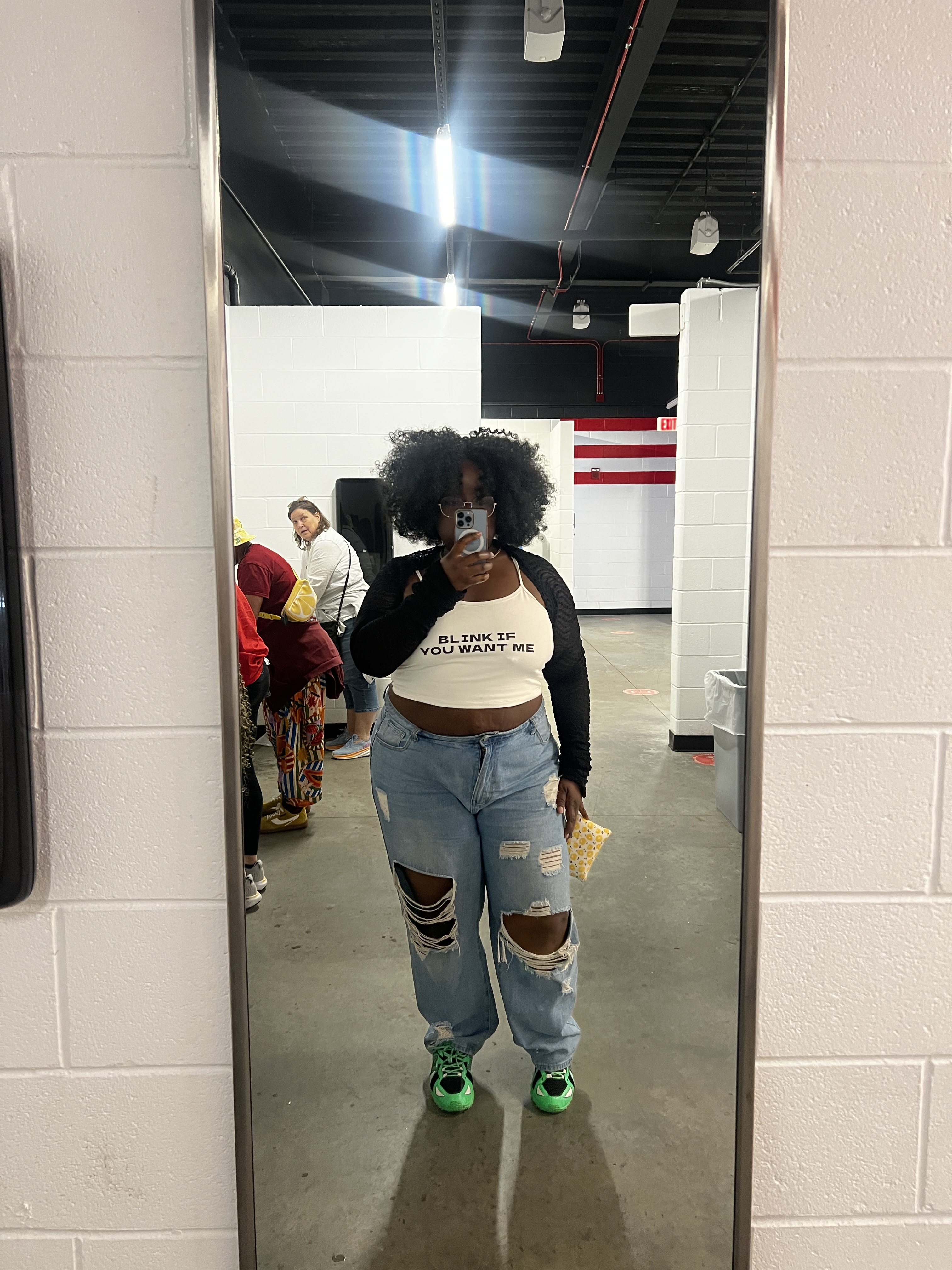 While I was out, I had a few people stop to read my top, take pics, or even say, “Trust me, I’m blinking.” The response was exactly what I expected. I wore it again to a game, and the responses were even better. I kiki’d with a group of women who were sitting next to me, and even a few people who worked there got a laugh and blinked my way. Then, after posting it on IG, people from my community asked where they could get the top, so I thought to myself, why deprive people of what they want?